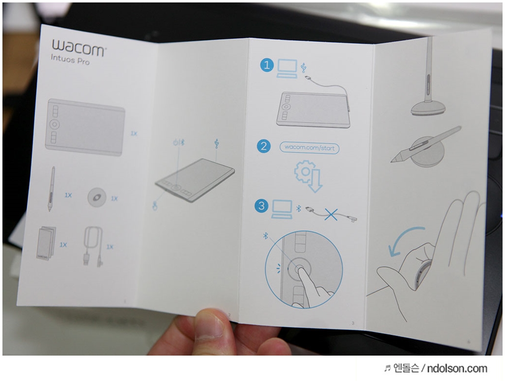 인튜어스 프로 소형의 매뉴얼을 보면, 사용법이 나옵니다. 무선/유선을 모두 지원하는 것과 우측에 있는 버튼을 눌러서 터치로 사용할 수 있고, 블루투스로 연동시킬 수 있다고 나옵니다.