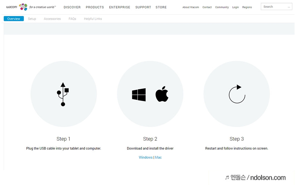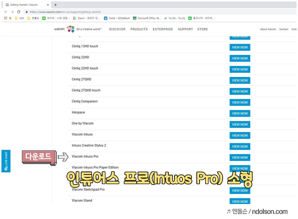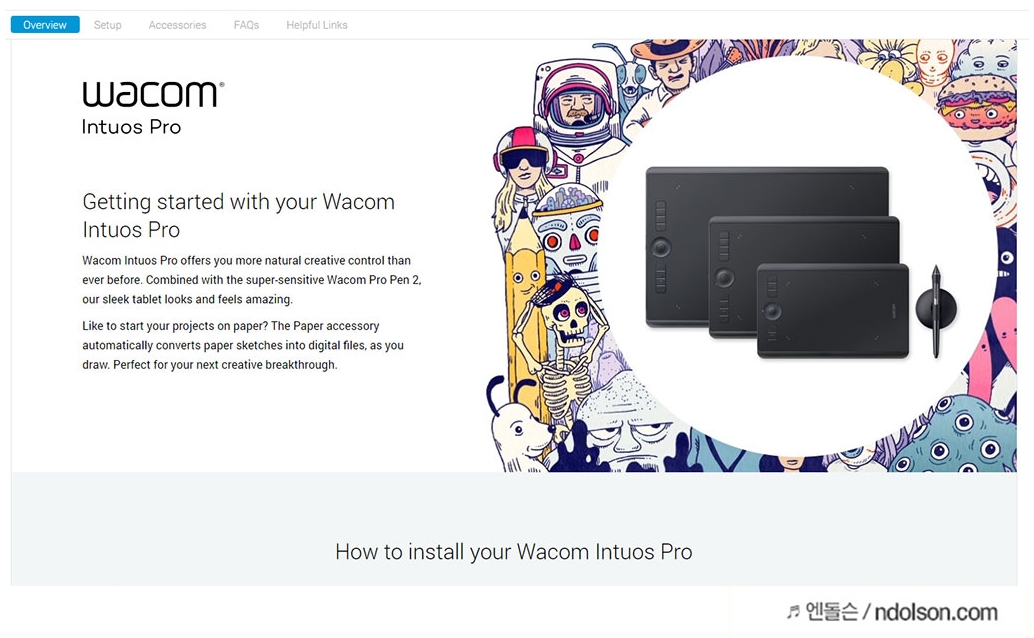 와콤 퀵스타트 페이지로 이동하여 프로그램을 설치합니다. Wacom Intuos Pro라고 쓰여 있는 페이지를 열어 설치하시면 됩니다.
