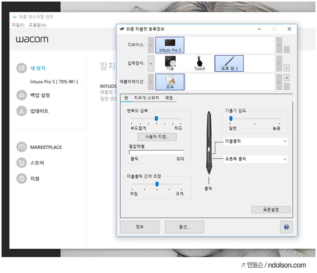 와콤 전용 소프트웨어에서 장치에 대한 상세한 설정이 가능합니다. 와콤 데스트 탑 센터에서 펜 설정과 익스프레스 키 등의 설정을 할 수 있습니다.