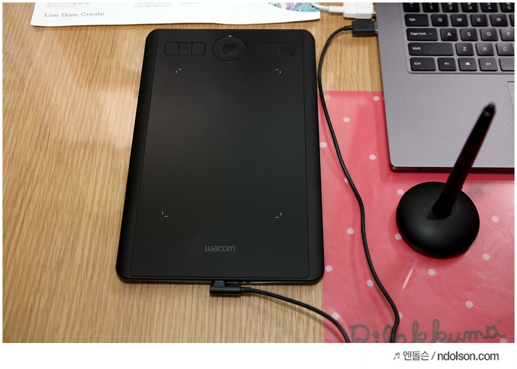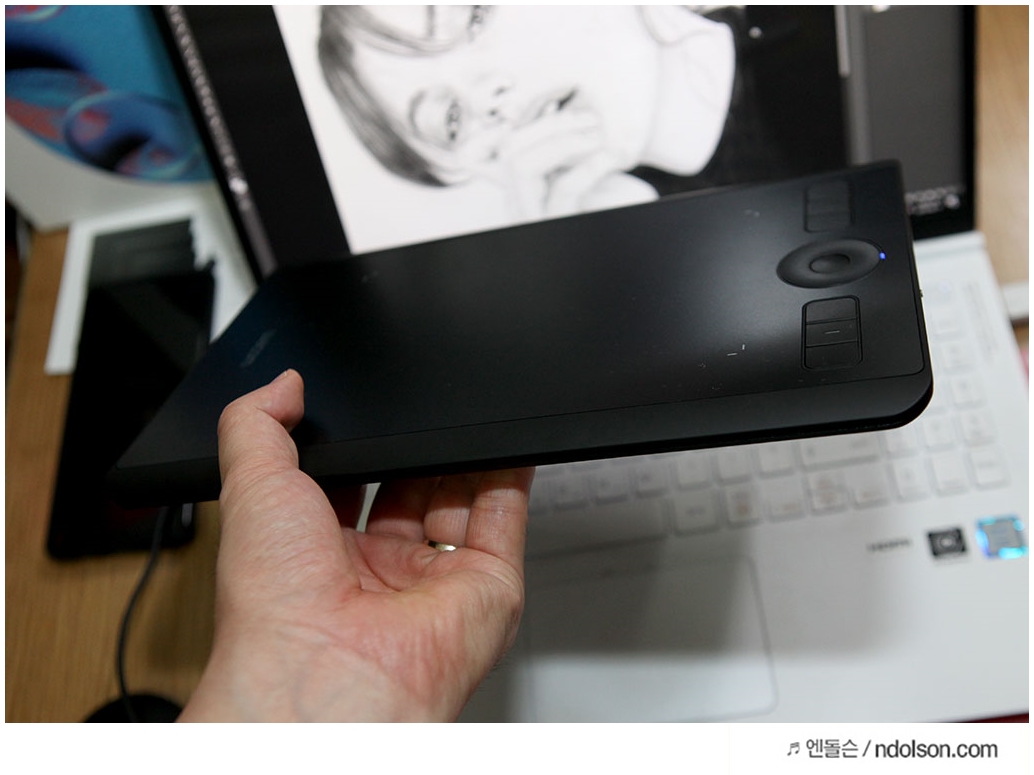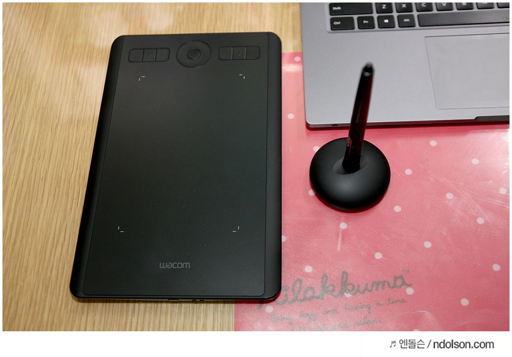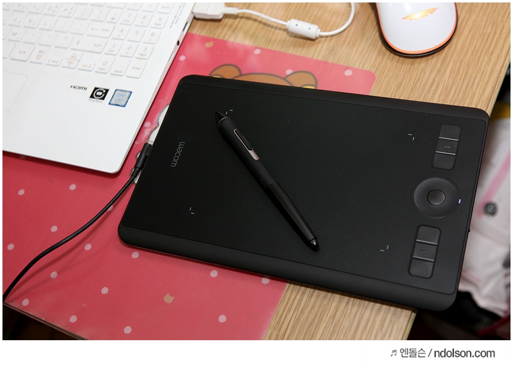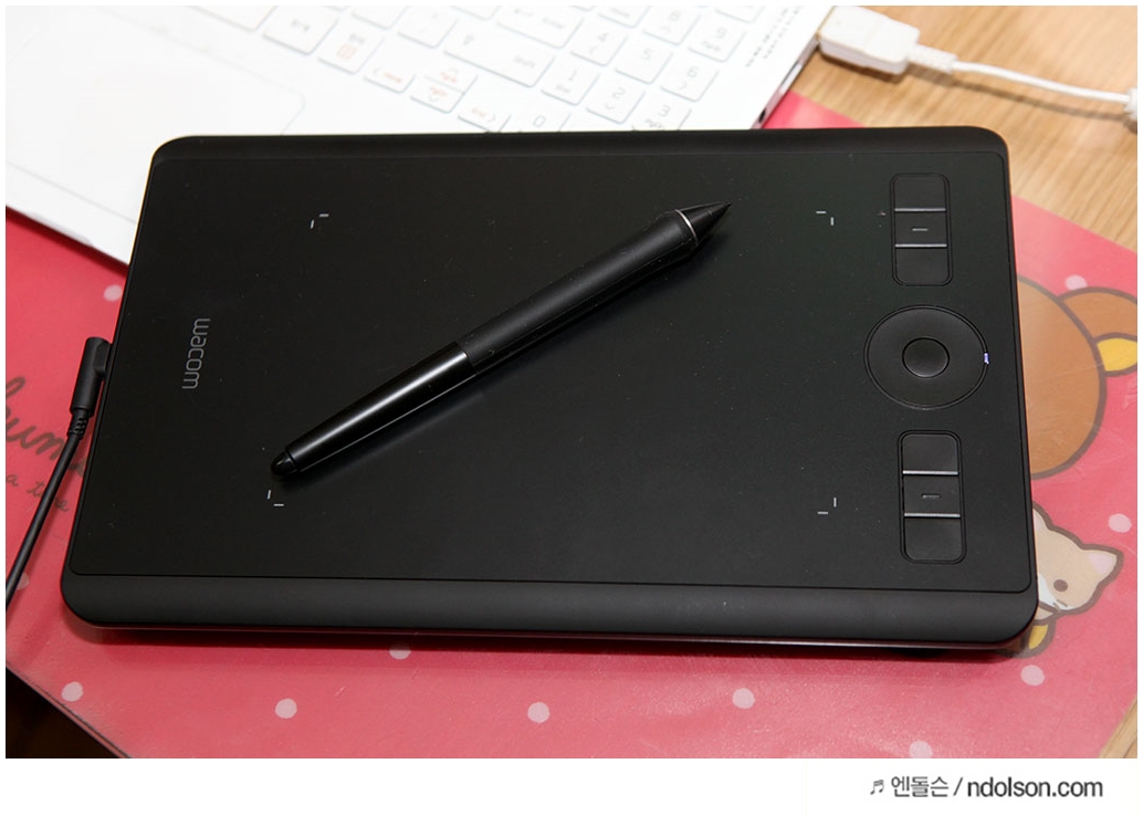 이번 새로운 펜 타블렛 <인튜어스 프로 소형>을 1주일간 사용해 보았습니다. 타블렛하면 와콤으로 통하는 기술력과 소형으로 더욱 휴대성이 좋고, 무건전지로 작업할 때 건전지 신경 쓰지 않아도 되는 편의성과 작업에 필요한 익스프레스키(ExpressKeys™) 및 터치링(TouchRing) 등을 모두 갖추고 있어서 풀 패키지라고 할 수 있었습니다.