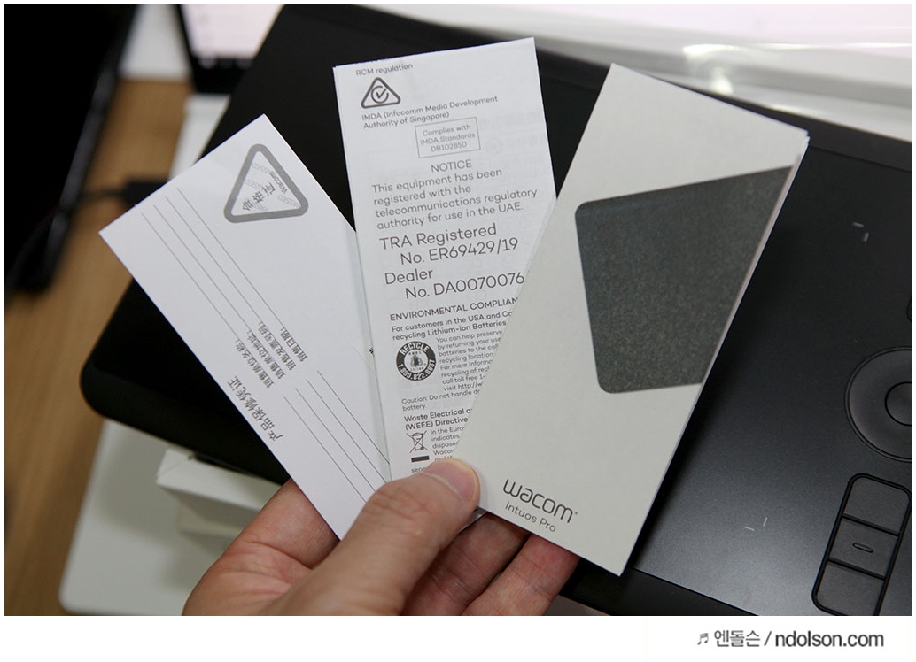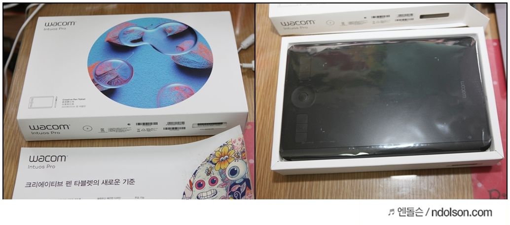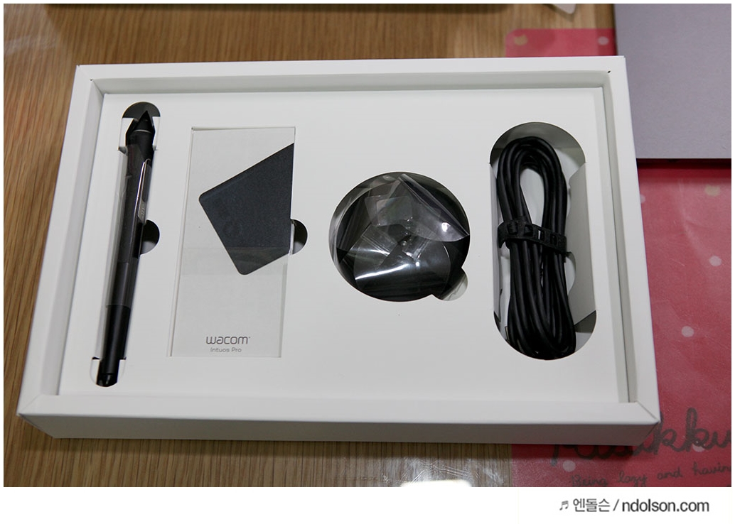 와콤 인튜어스 프로 소형을 개봉하여 보았습니다. 구성품은 타블렛, 스타일러 펜, 매뉴얼 및 보증서, USB 케이블, 펜 거치대로 구성되어 있습니다.