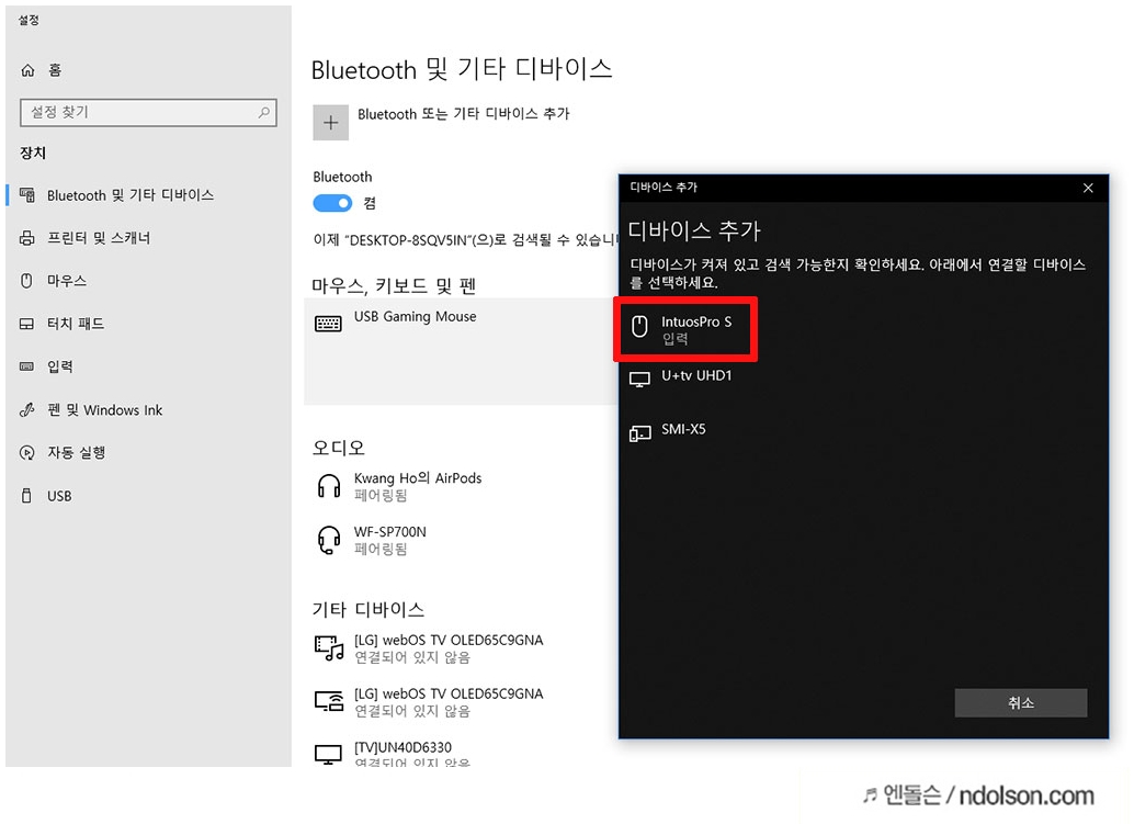 블루투스 장치로 무선으로 연동할 수 있습니다. 노트북의 블루투스에서 Intuos Pro 을 찾아서 선택합니다.
