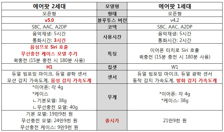 에어팟 1세대와 2세대 스펙 비교된 표를 보면 달리진 기능을 손쉽게 알 수 있습니다.