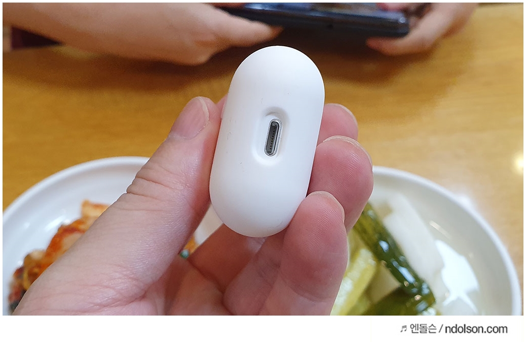 가장 큰 특징은 상단에 LED가 없습니다. 이제 무선충전과 유선이 같이 되기 때문에 무선충전 케이스 상단에 LED가 없습니다. 무선충전 패드 위에 올려 두면 편리하게 케이스 밖으로 빠졌습니다.