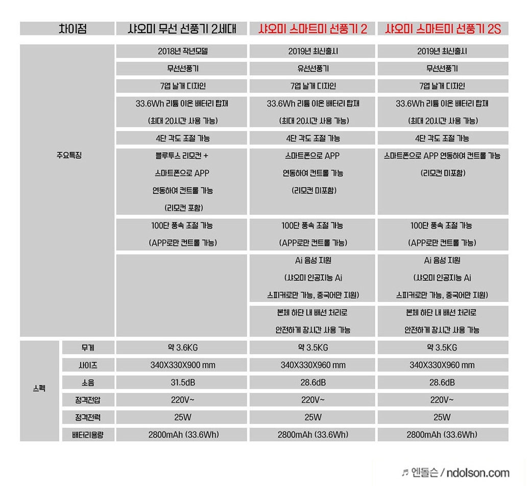 그럼 샤오미선풍기의 스펙을 비교해 보겠습니다. 샤오미선풍기 2세대, 샤오미선풍기2, 샤오미선풍기 2S(3세대) 입니다. 비슷하지만, 유선/무선이냐에 따른 차이 납니다. 또한 100단계의 자연풍을 지원하는 지, 인공지능 AI음성을 지원하는 지의 차이가 있습니다.