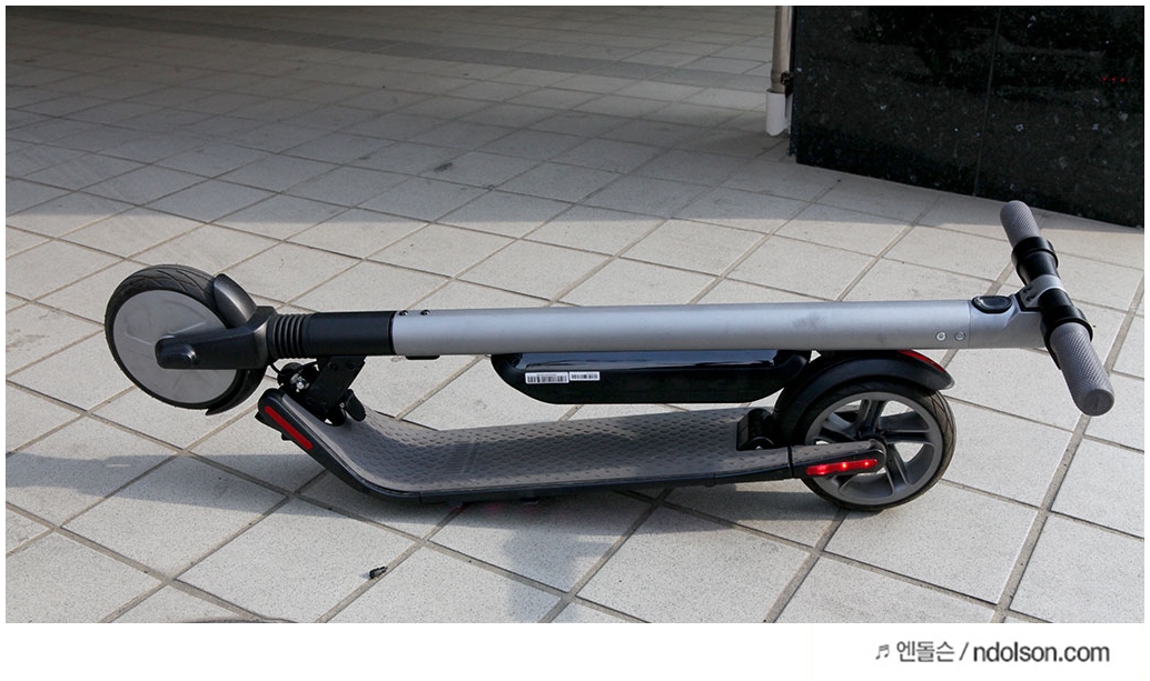 폴딩 너무나 편합니다. 접이식 전동킥보드를 구매하는 이유가 이때문인데요. 보조배터리를 달아도 접는 데 문제가 없습니다. 나인봇 ES2에 배터리를 달고 단점으로는 충전선이 보조배터리에 연결해주어야 하는 데, 이게 접었을 때 편하게 안되서 핸들을 옆으로 돌려야 하더군요.