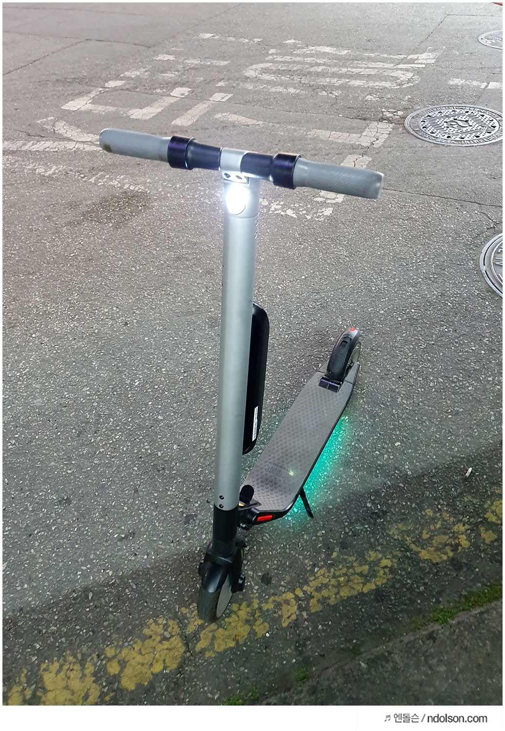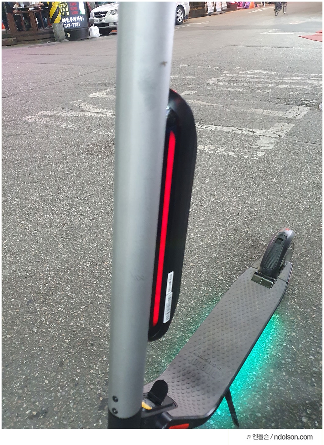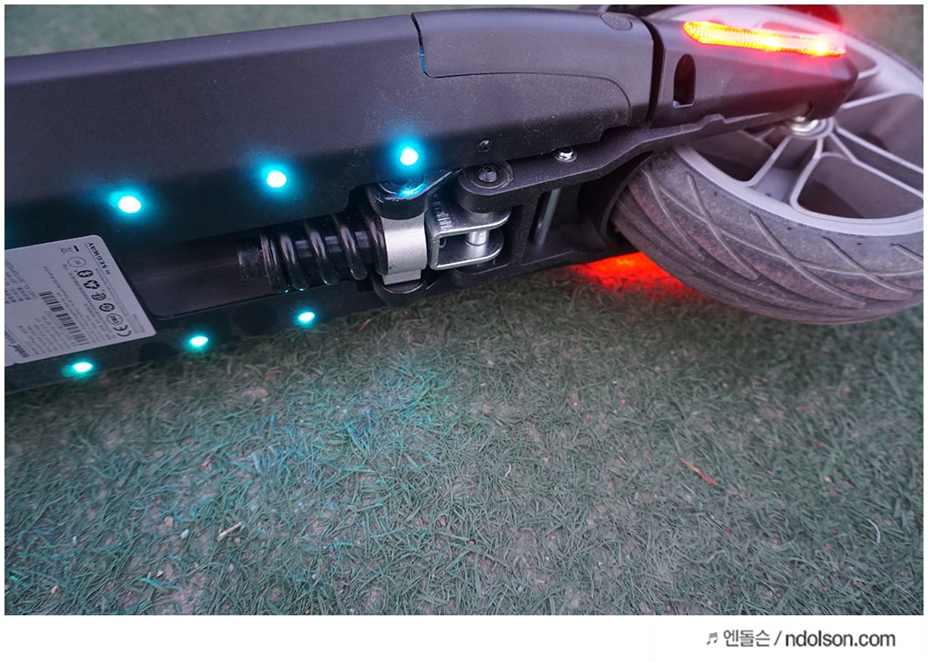 전동킥보드 튜닝을 하지 않아도 하단에 LED가 박혀 있습니다. 그래서 나름의 튜닝효과와 야간에 탈 때 멋지고 안전합니다. 앱에서 색상 조정이 가능해서 원하는 색상으로 변경할 수 있습니다.