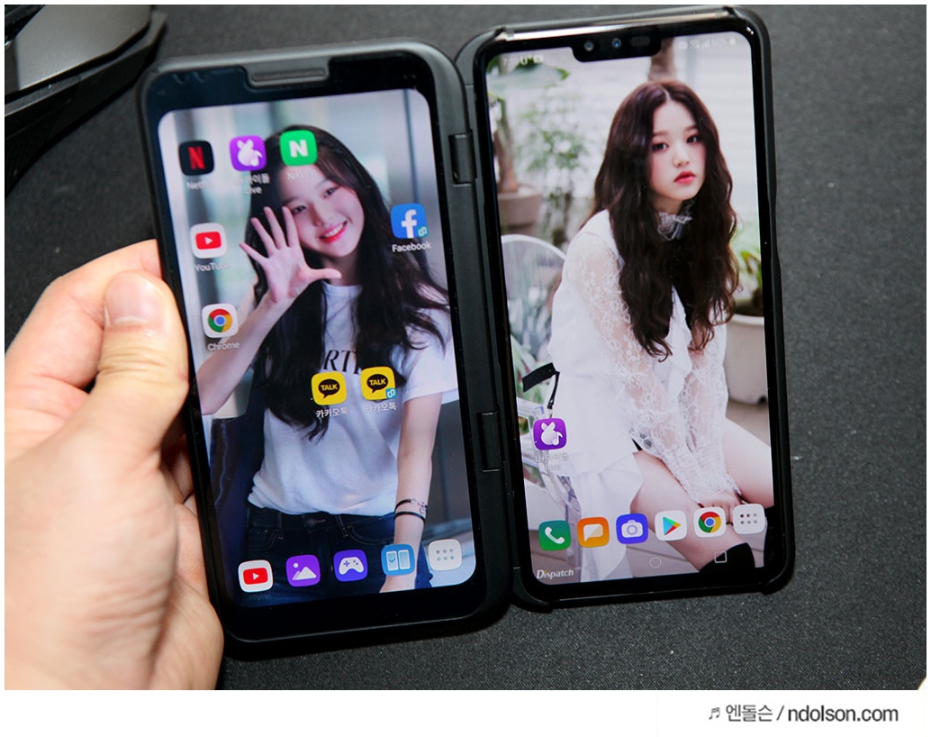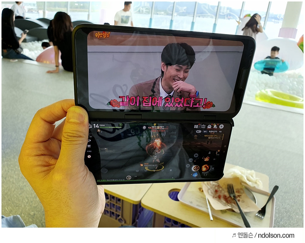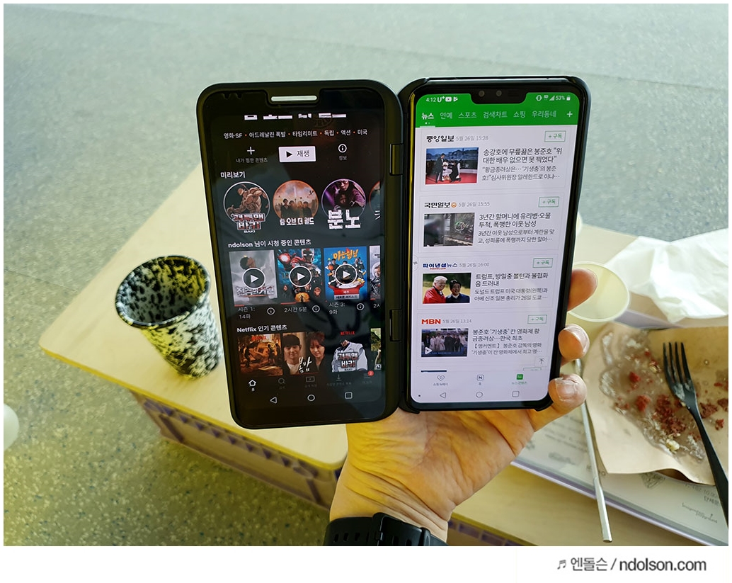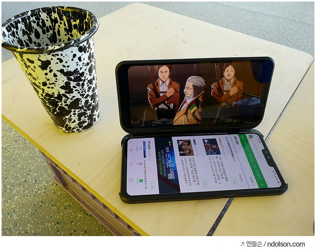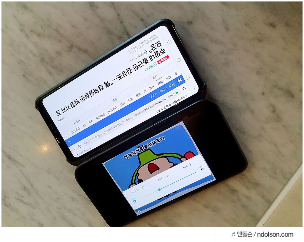LG V50듀얼스크린에는 화면을 180도 회전 기능이 있습니다. 이렇게 하면 세워 놓고 같이 볼 수 있습니다.