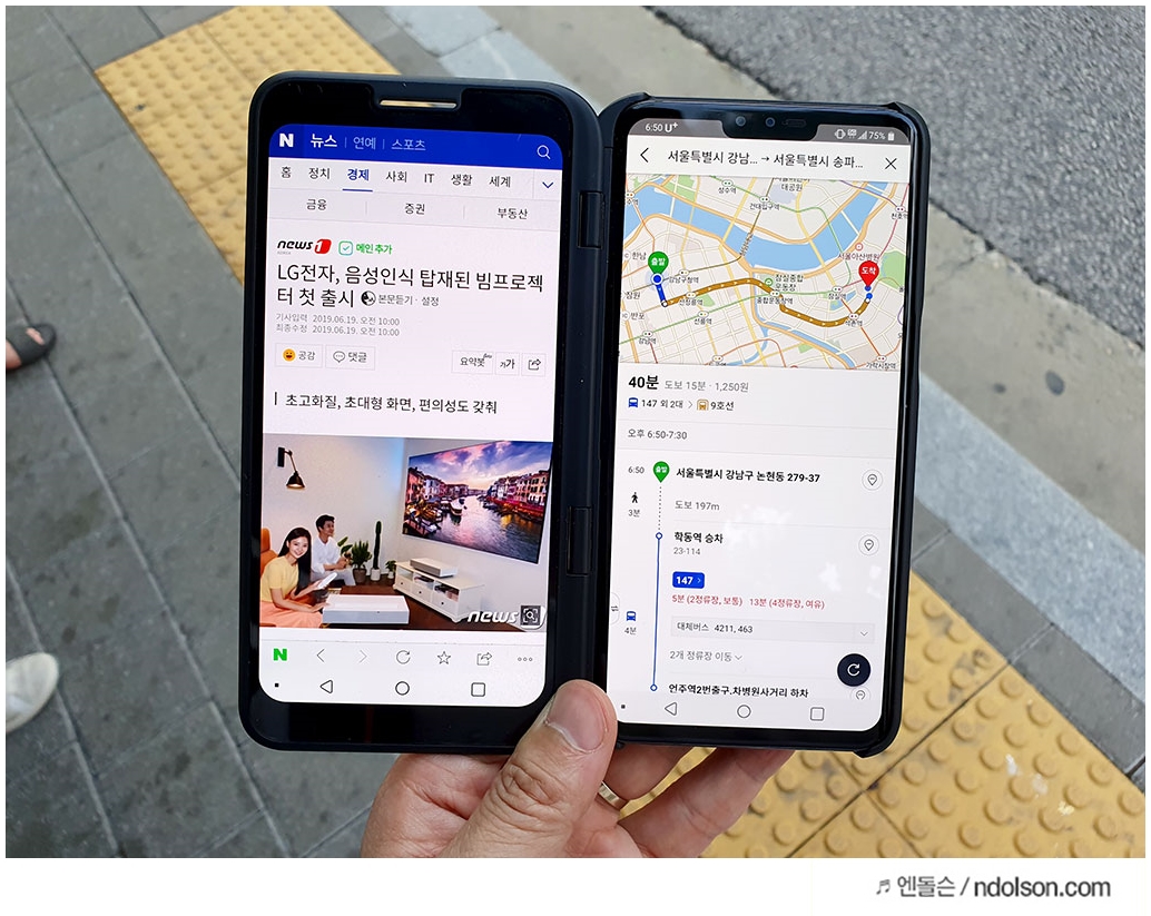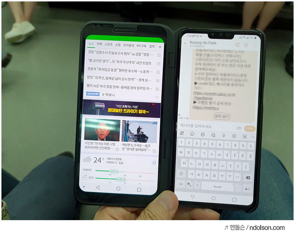 문자가 와서 문자도 보고 웹서핑을 하는 것도 무척 편리합니다. 다양한 멀티작업이 LG V50은 듀얼모니터처럼 가능합니다.