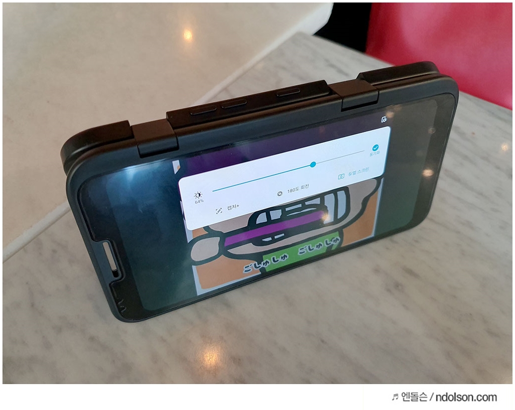 LG V50듀얼스크린에는 화면을 180도 회전 기능이 있습니다. 이렇게 하면 세워 놓고 같이 볼 수 있습니다.