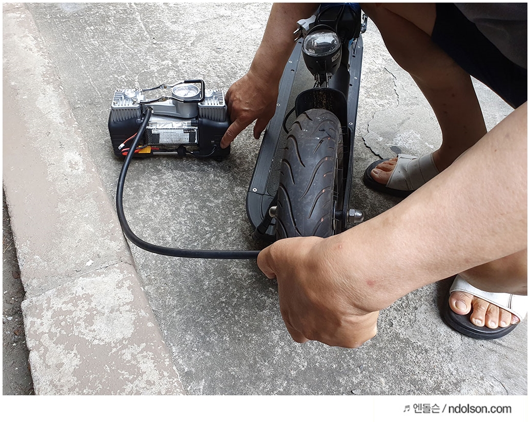 바퀴가 터지는 경우도 있다지만, 한 번도 아직 그런 경험은 없었습니다. 공기타이어의 10인치라 쿠션감이 서스펜스 부럽지 않습니다.