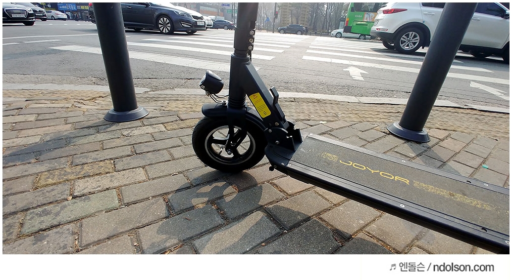 조요 전동킥보드의 장점은 발판이 넓어 두 명이 타도 됩니다. 핸들까지 접히는 접이식이라 공간 차지가 적습니다. 또 10인치의 공기타이어라 서스펜스 부럽지 않은 쿠션감을 줍니다. 또 10인치라 보도블록을 넘는 것도 쉽습니다. 힘이 좋아 등판도 나름 만족합니다. 자전거처럼 기계식 브레이크라 꽉 잡으면 내리막에서도 밀리지 않습니다. 별도의 액세서리가 필요 없이 자전거 벨(전자음 빵빵)과 라이트를 지원합니다.