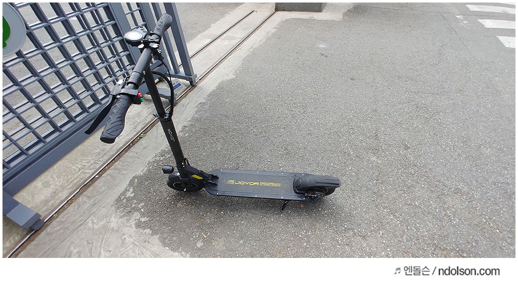브레이크의 경우 전자식이 아니라 기계식이라 자전거처럼 꽉 잡으면 다운힐에서도 잘 서 있을 수 있습니다. 전자식은 브레이크를 잡으면 내리막길에는 내려가는 불편함이 있었지만, 조요 전동킥보드는 그런 점이 없어서 좋습니다.