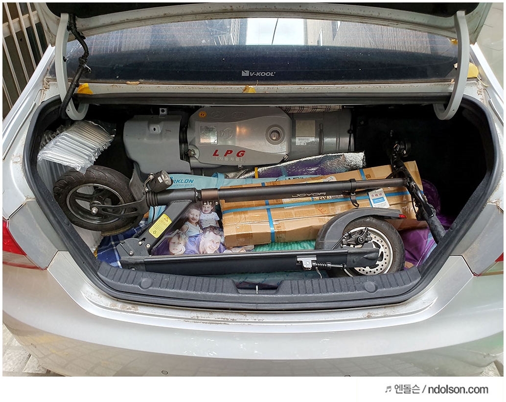 접이식이라 YF소나타 기준으로 뒷트렁크에 잘 들어갑니다. 핸들까지 접히는 접이식 전동킥보드라 좋습니다. 다른 전동킥보드도 사용해보았지만, 핸들은 보통 안 접히는 데, 매우 좁게 접을 수 있어서 좋습니다.