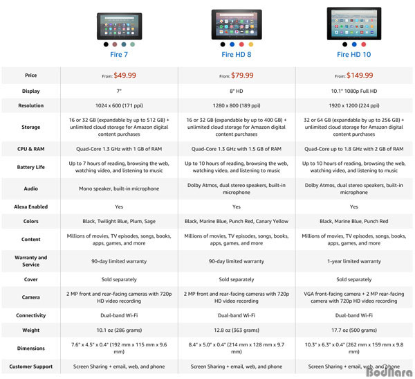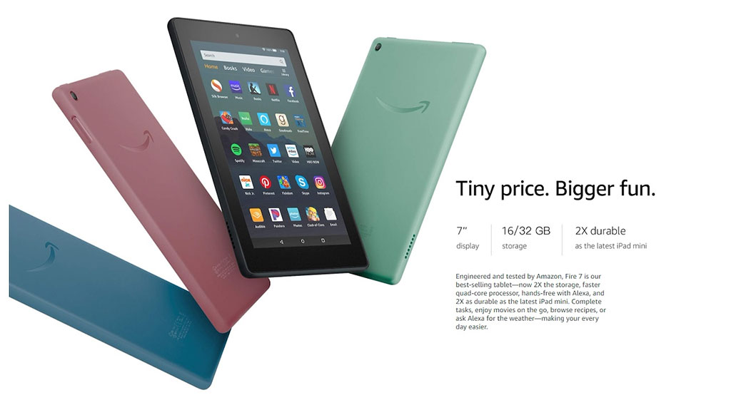 아마존의 태블릿은 7인치, 8인치, 10인치가 있습니다. 아마존 킨들 파이어는 저렴한 가격으로 아마존의 쇼핑 및 영화, 전자책을 볼 수 있는 생태계를 구축해 줍니다.