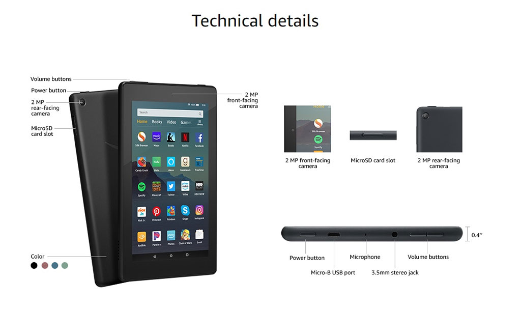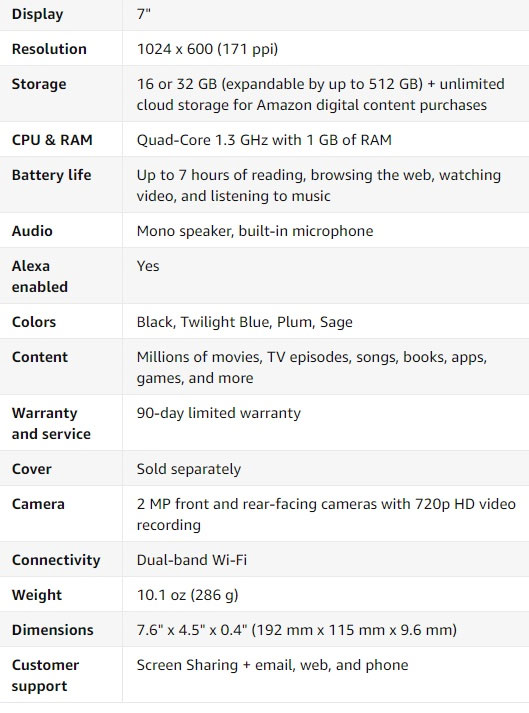 이번 신제품인 아마존 7인치 2019 제품의 스펙을 보면, 1024x600 해상도 7인치 IPS 디스플레이와 720p HD 영상 채팅이 가능한 전후면 200만 화소 카메라, 듀얼 밴드 Wi-Fi, 최대 7시간 사용 가능한 배터리, 아마존 프리타임 서비스 등을 제공합니다.