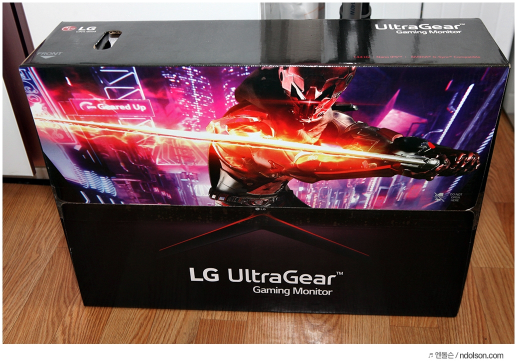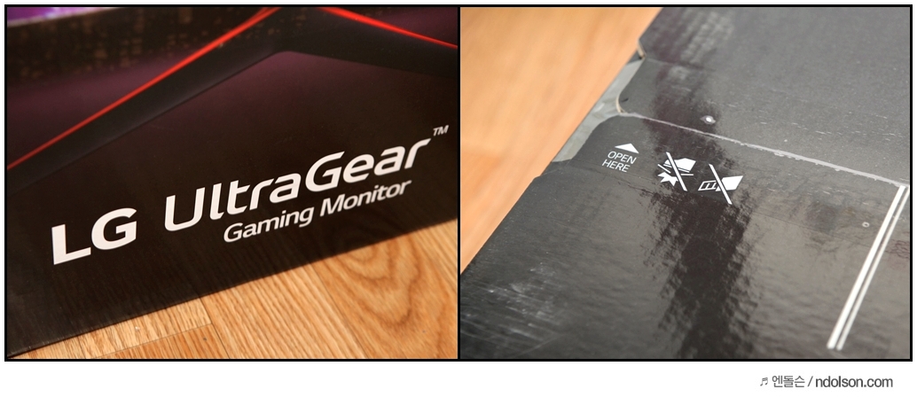 필자의 집에 택배가 왔습니다. 전면에 LG UltraGear Gaming Monitor(LG 울트라기어 게이밍 모니터)라는 문구가 인상적으로 눈에 들어왔습니다. 또 모니터 박스를 개봉할 때 위/아래를 알려주어 어느 쪽을 오픈해야 할지도 세심하게 배려해두었습니다.
