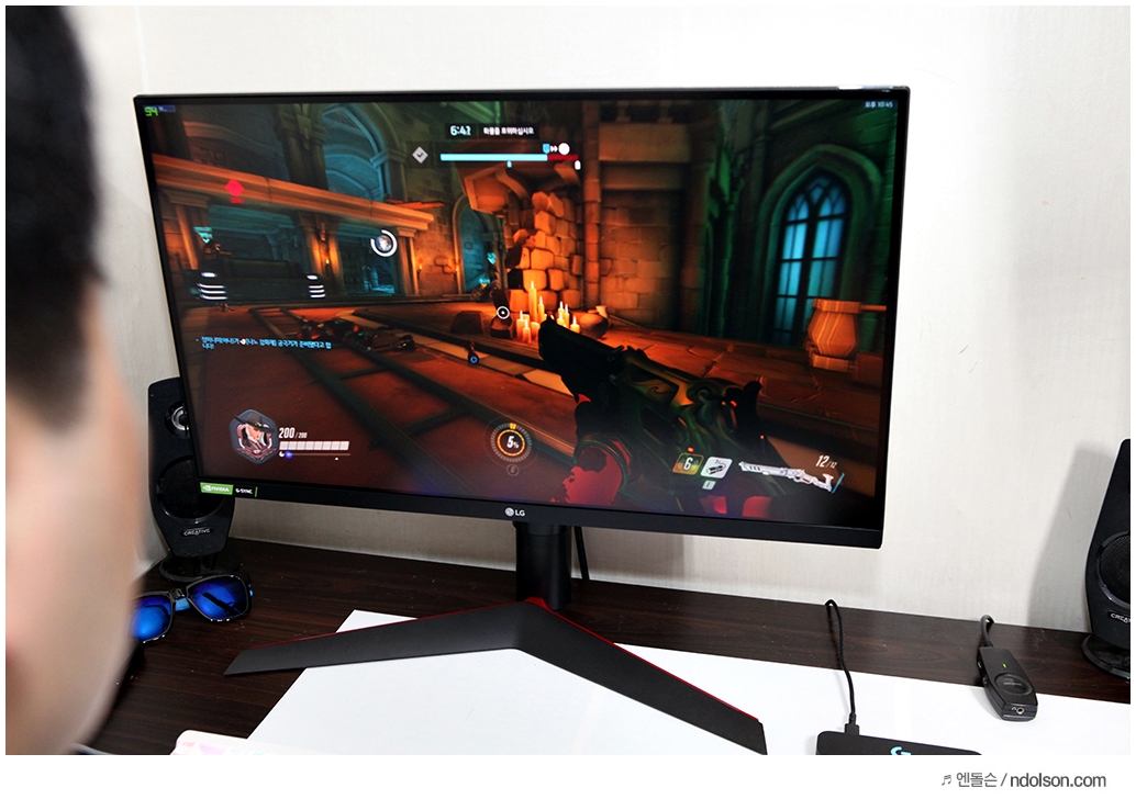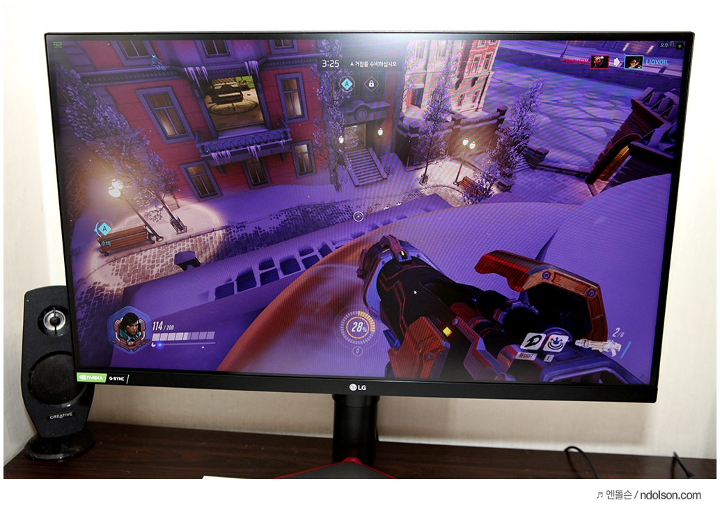 세계 최초 나노 IPS 1ms 가 적용된 모니터라는 것과 144Hz의 고주사율을 지원으로 오버워치 같은 빠른 템포로 진행되는 FPS 게임에 적합했습니다. 350nits 밝기로 충분히 밝고 안티글레어가 적용되어 있어 형광등 밑에서 게임을 해도 빛 반사가 일어나지 않아 게임에 지장을 주지도 않습니다.