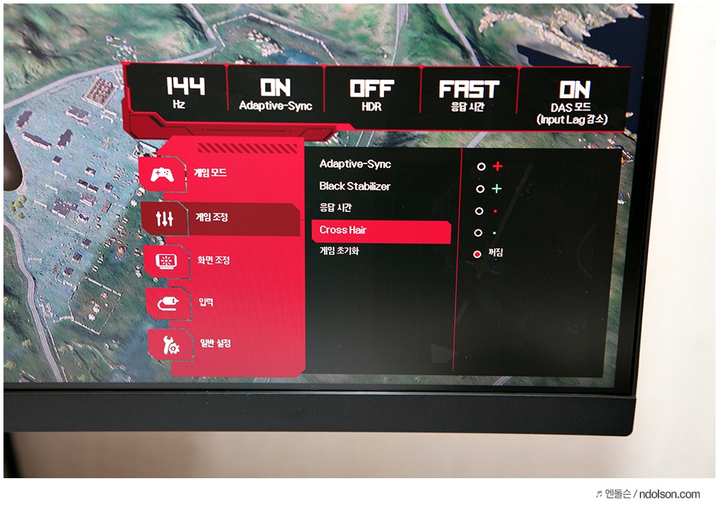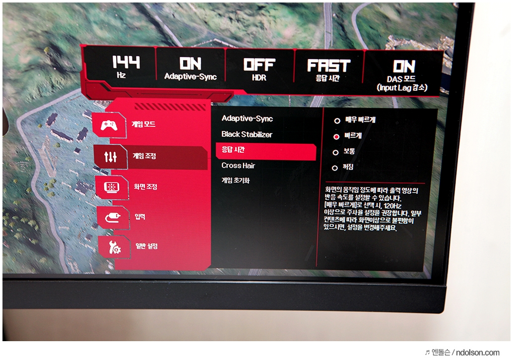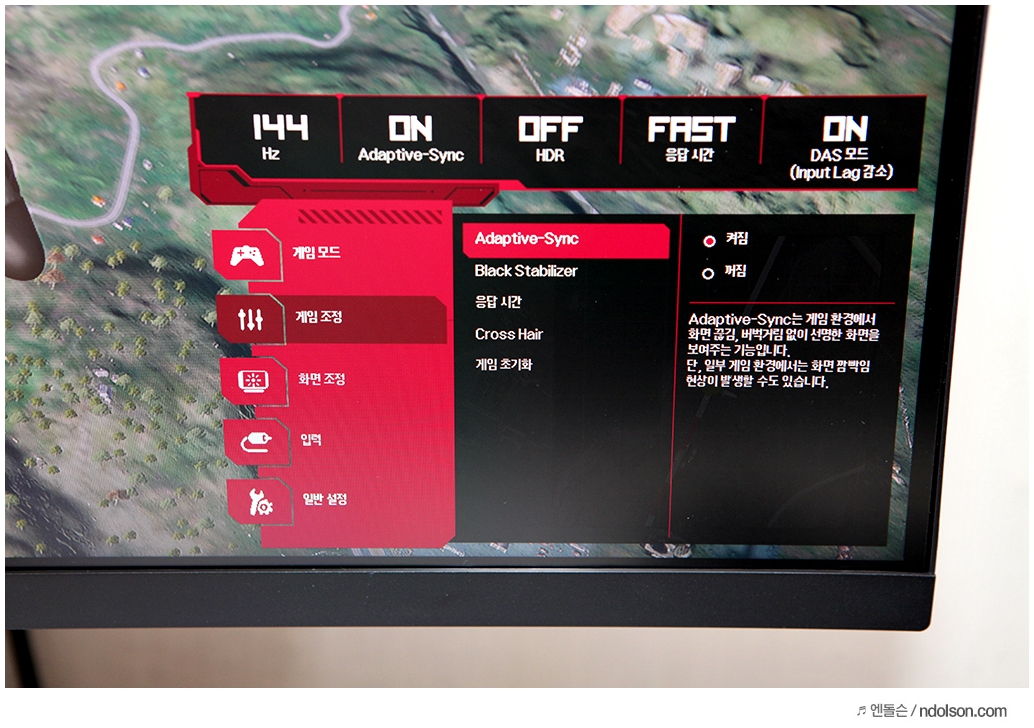 또 알아야 할 것이 LG 울트라기어 게이밍모니터 27GL850의 Adaptive-Sync 설정을 ON 해주면 게임할 때 버벅거림과 화면 끊김 현상이 발생하지 않았습니다. 이런 설정은 게이밍 모니터가 갖춘 특화된 설정으로 일반 모니터에서는 느낄 수 없어 게임을 할 때 매끄러운 느낌을 받을 수 있었습니다.