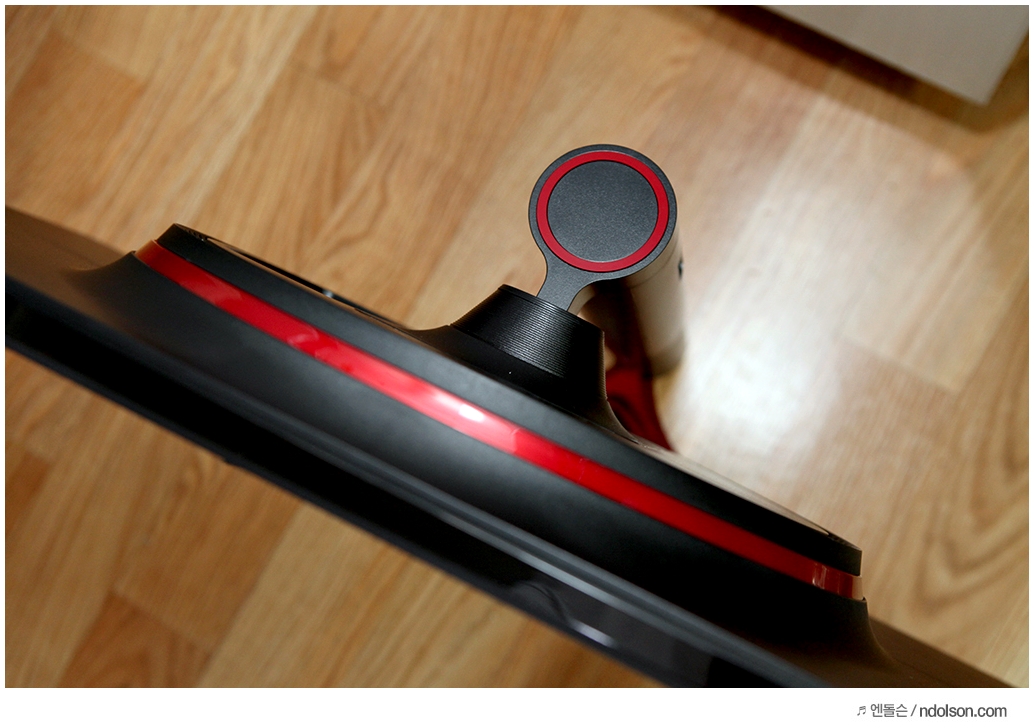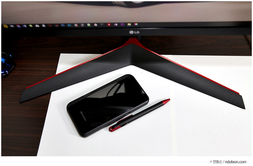 마치 태권도V의 가슴팍의 부메랑처럼 V브이자 모양의 받침대 디자인을 갖추고 있습니다. 블랙/레드의 강인한 느낌을 주었는데, 책상 위에 스마트폰이나 볼펜 등을 올려 둘 공간을 준다는 점에서 좋습니다.