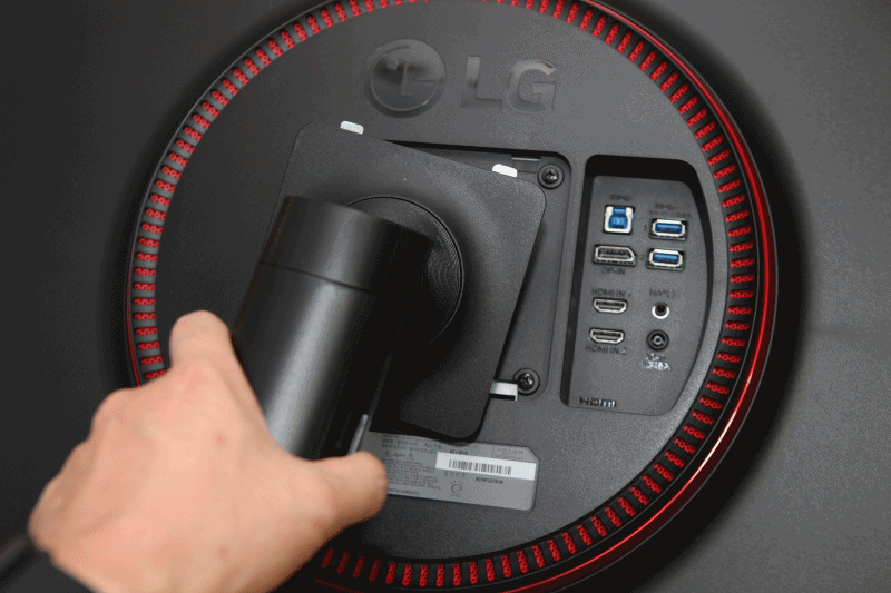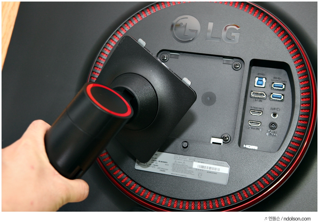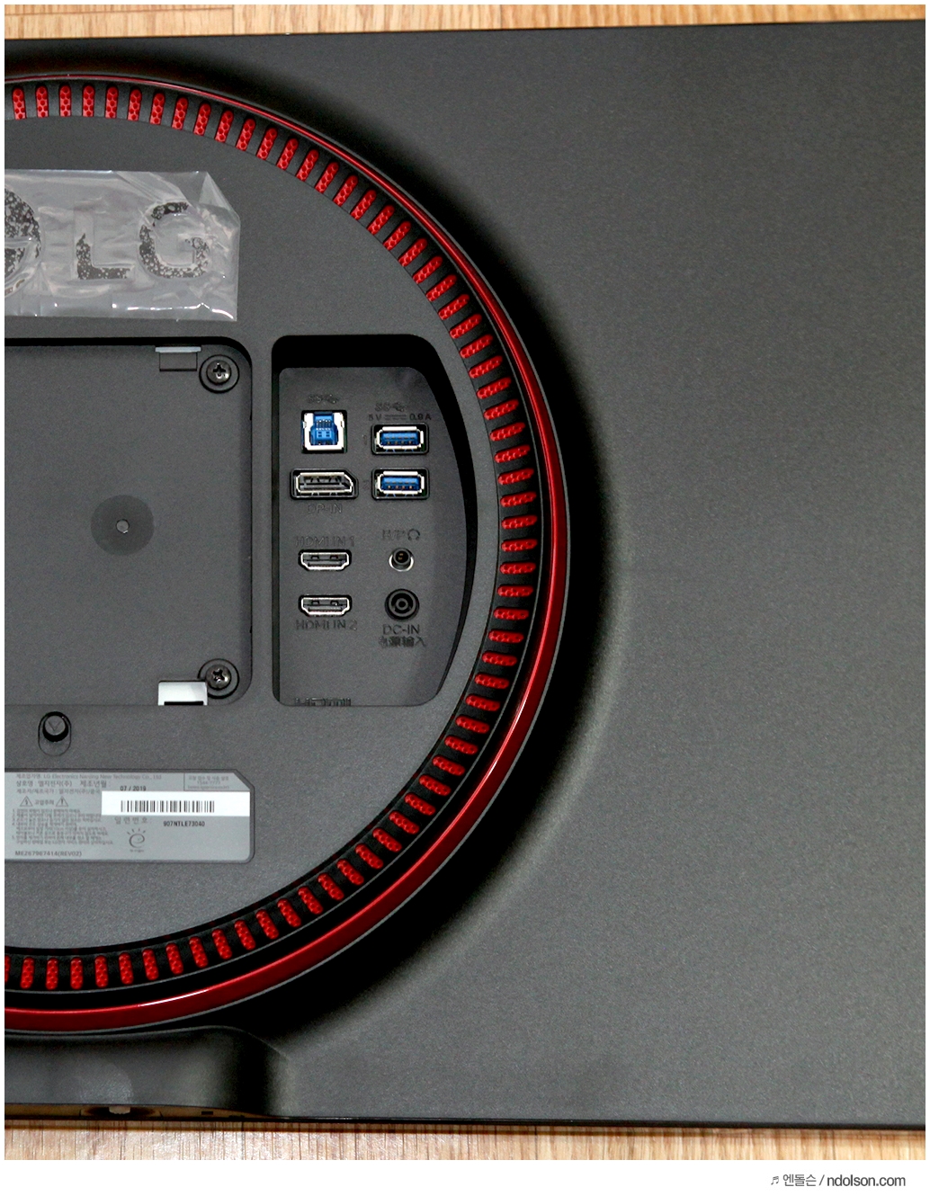 LG 모니터의 후면은 레드의 동그란 디자인이 유니크합니다. 볼 때마다 멋진 느낌을 줍니다. 후면에는 Type-B 인터페이스와 Display Port(DP포트), USB 3.1 포트x2와 HDMI단자x2, 오디오 단자를 지원합니다. 모니터 확장에 적합한 HDMI 단자를 무려 2개를 갖추고 있습니다.