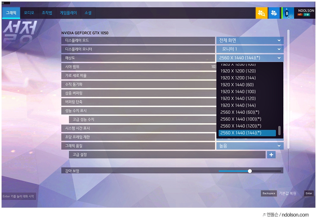 오버워치 게임 해상도는 2560 x 1440에 144Hz로 설정하였습니다. QHD 해상도로 게임을 즐기기에 높은 퀄리티를 보여 주었습니다. 오버워치 게임을 하는 동안 97~100 프레임을 유지하여 주었습니다.