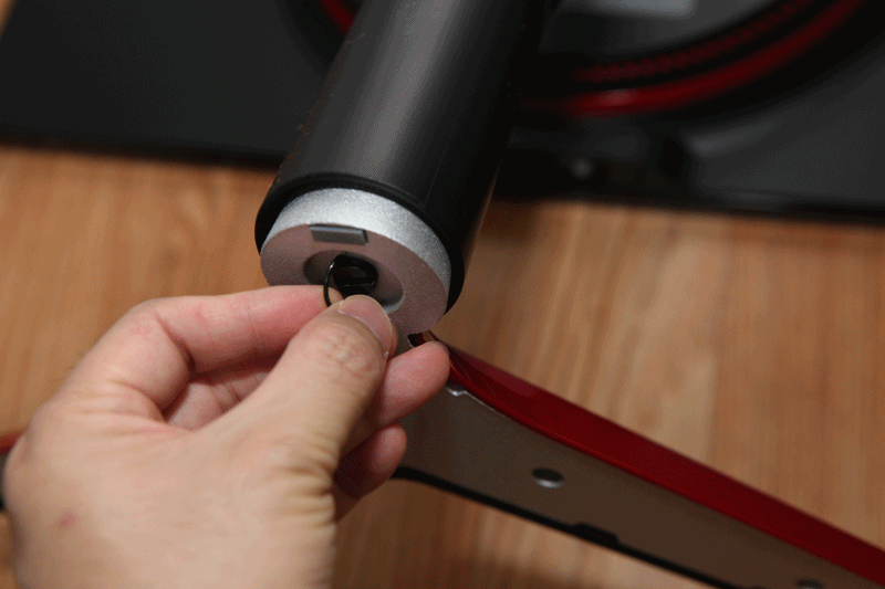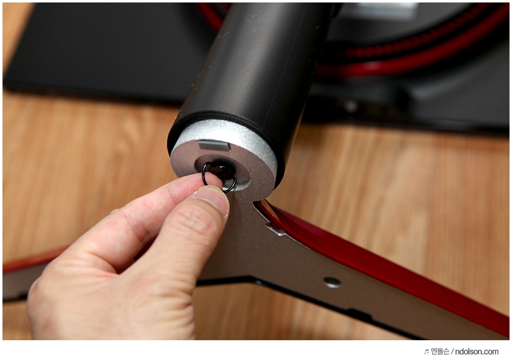 받침대 부분도 손나사로 돌려 도면 조립이 끝납니다. 이제 모니터 초기 설치가 끝났습니다.