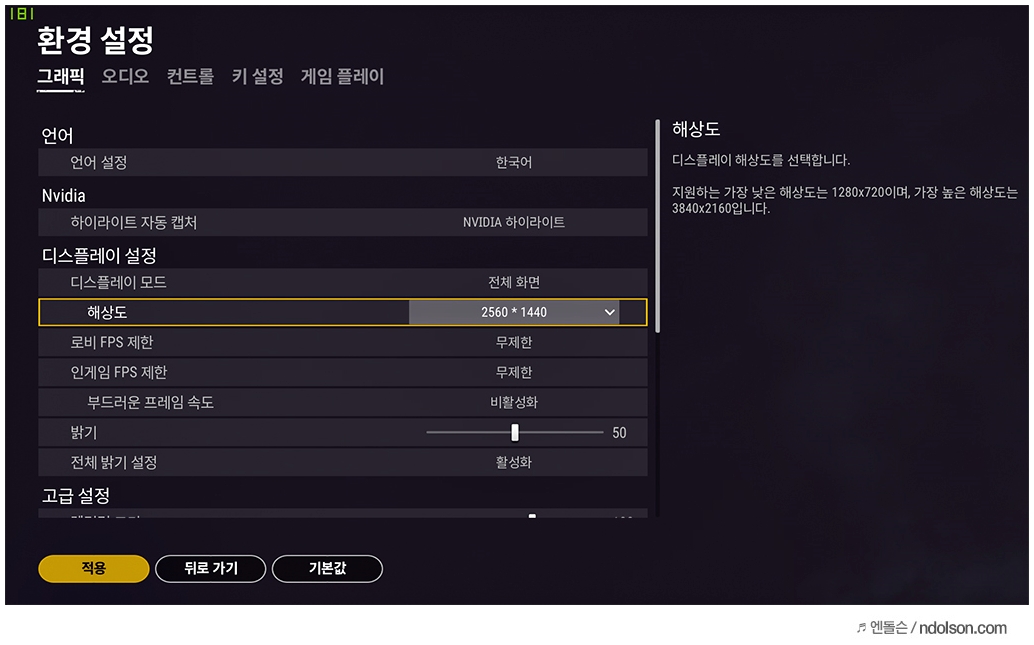 배틀그라운드 게임 해상도는 2560 x 1440으로 설정하였으며 그래픽 프레임 제한 없이 설정하였습니다. 최대 144Hz를 지원하는 배틀그라운드에서 LG 울트라기어 게이밍 모니터 27GL850로 최대 퍼포먼스까지 즐겨 볼 수 있습니다.