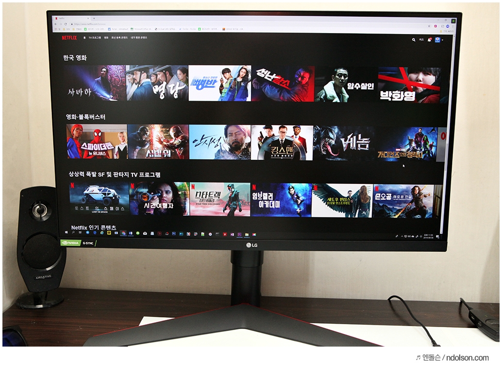 LG 울트라기어 게이밍모니터 27GL850은 HDR 10(High Dynamic Range)을 지원하는 모니터입니다. 그렇기 때문에 넷플릭스, 유튜브 오리지널의 컨텐트를 재생할 때 더욱 선명한 영상 감상이 가능했습니다.