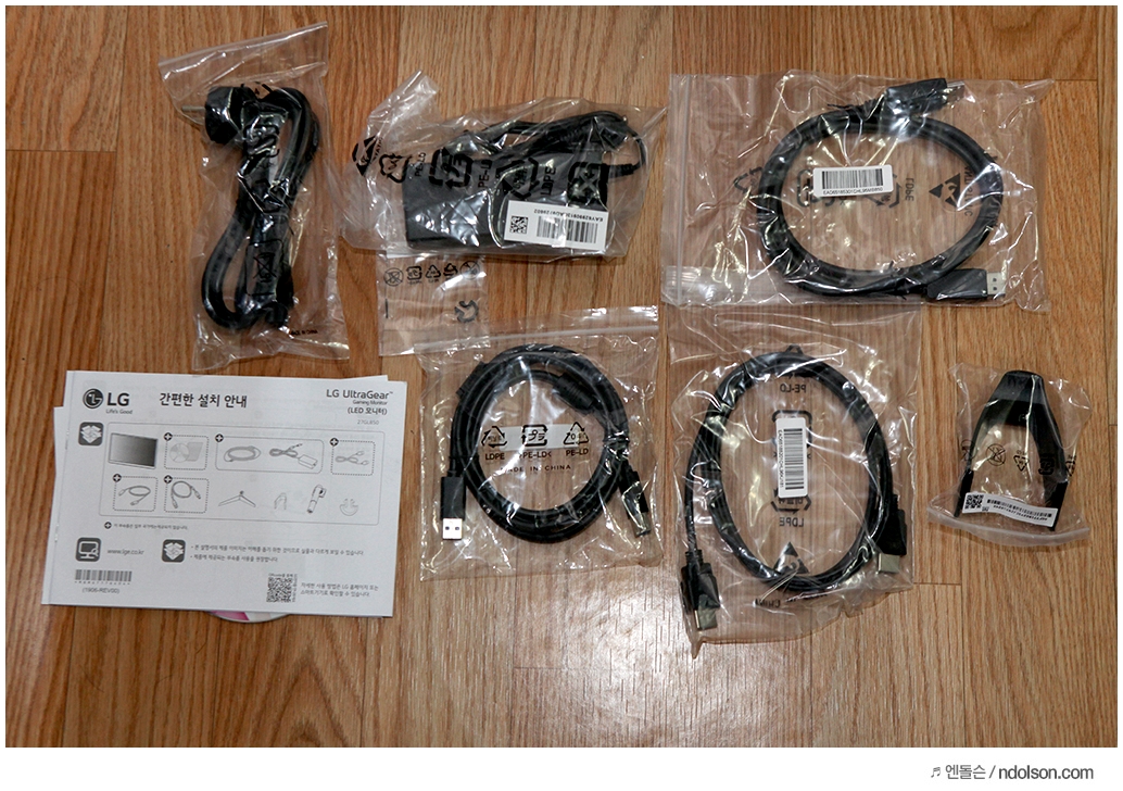 액세서리 킷에는 모니터 연결 케이블들이 들어 있습니다. 콘센트, 어댑터, DP/HDMI 케이블, 선 정리 액세서리, USB 케이블 등이 들어 있습니다.