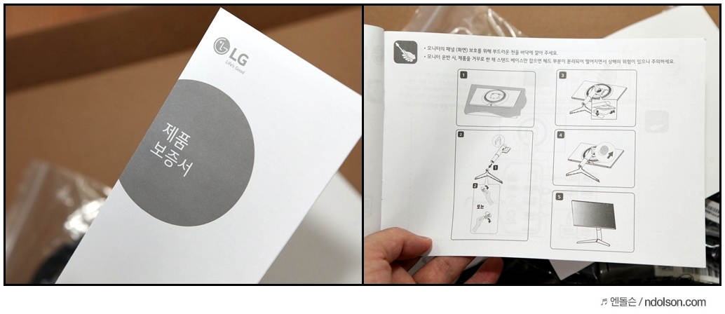 LG전자 모니터의 제품 보증서와 그림으로 쉽게 구성된 모니터 초기 설치 방법에 대한 매뉴얼이 있습니다.