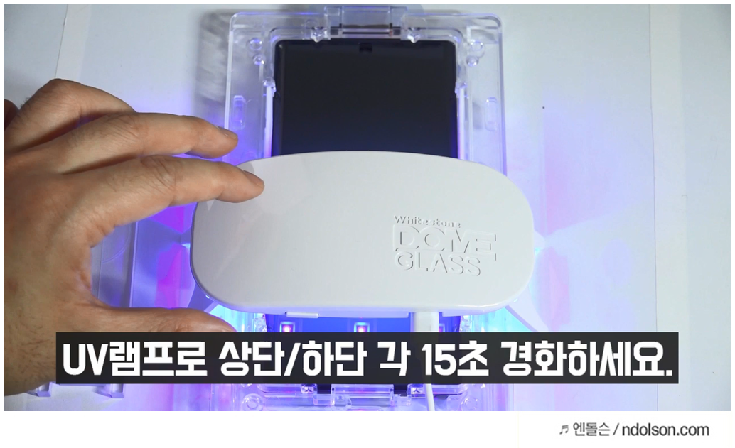화이트스톤 돔글라스 강화유리를 올려둡니다. 플라스틱 핀(Pin)에 걸려서 강화유리가 바로 점착액과 닿지 않습니다.