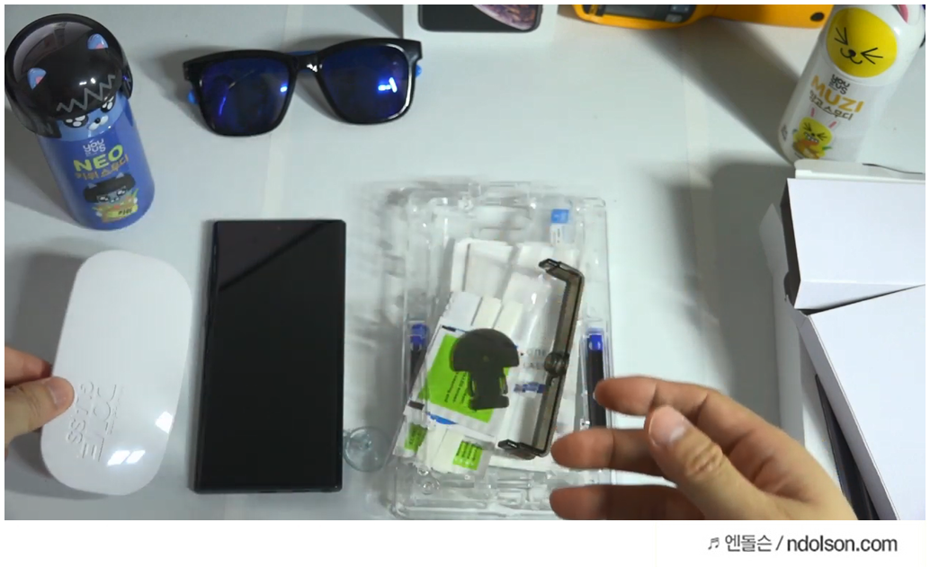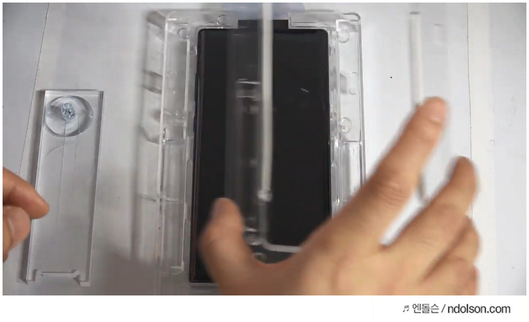 노트10에 강화유리를 붙일 때 틀위에 올려두고 작업하는 것으로 상당히 편한 시스템을 가지고 있습니다.