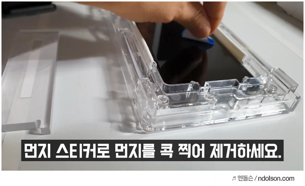그사이에 먼지가 또 올라갔네요. 먼지 제거 스티커를 U자로 만들어서 콕콕 찍어서 먼지를 제거합니다.
