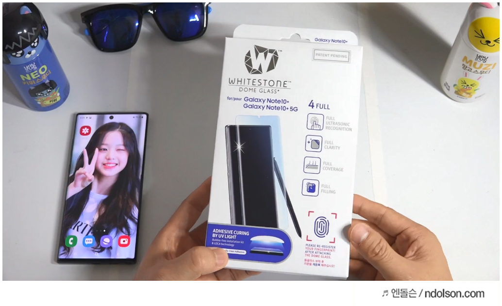 그러면 제가 가지고 있는 갤럭시노트10+ 5G 스마트폰에 화이트스톤 돔글라스를 붙여 보겠습니다. 영상을 꼭 2~3번 보시고 시작하세요!