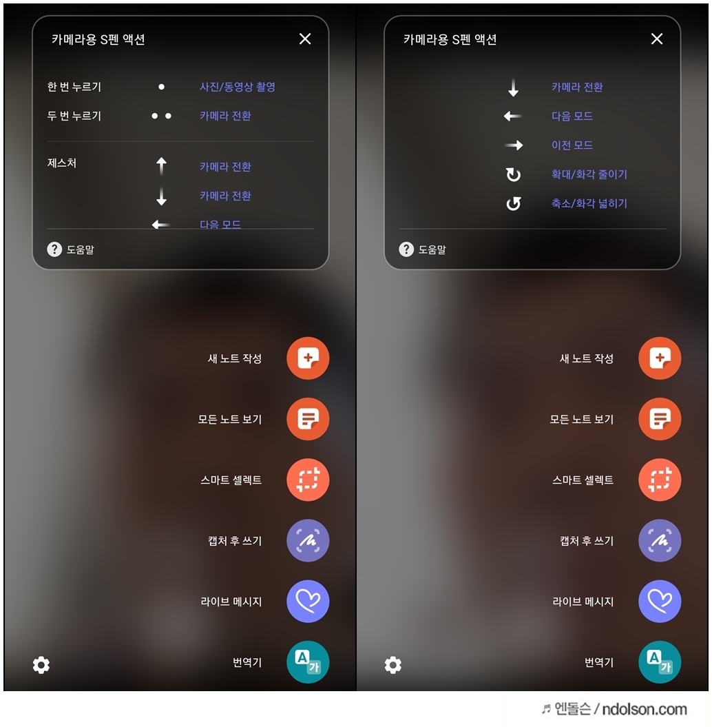 갤럭시노트10 시리즈 언팩행사에서 인상적으로 봤던 에어액션도 써보니 놀라웠습니다. S펜을 돌리면 줌인되고 위로 올리면 카메라 전면/후면이 바뀌는 등의 다양한 제스처를 할 수 있습니다.