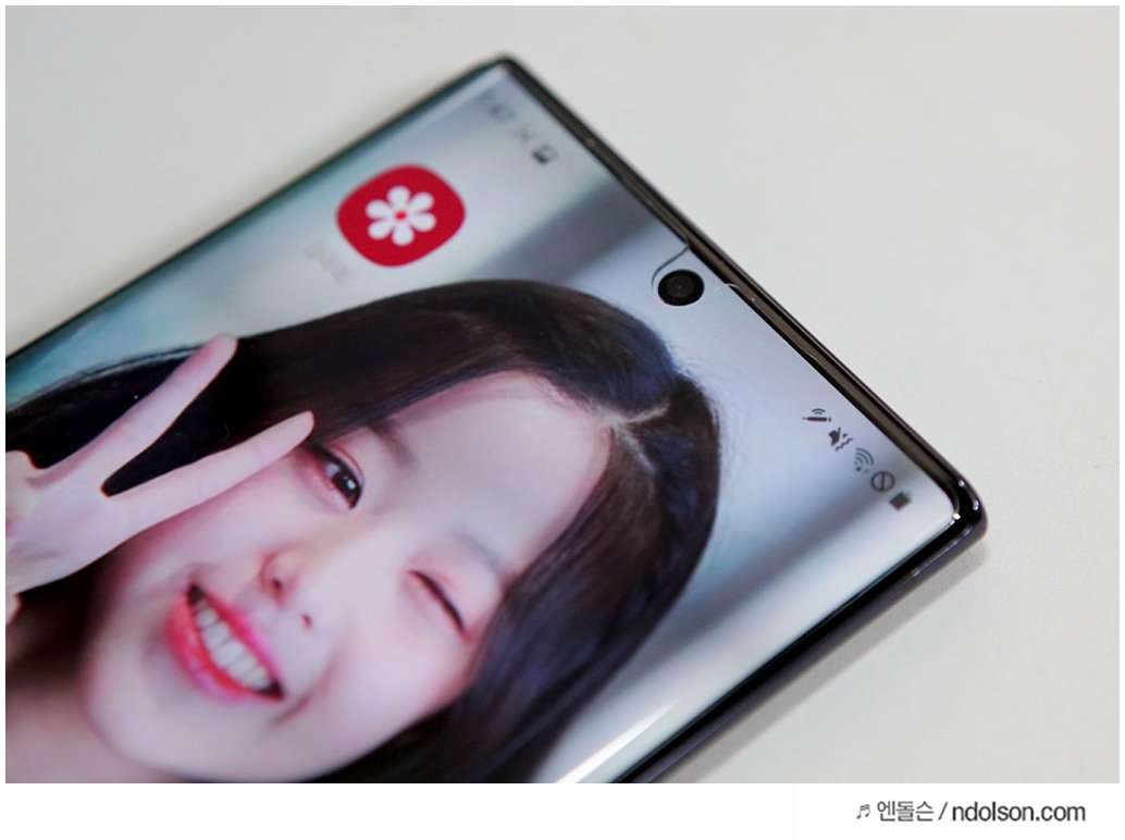 노트10의 전면에는 인피니티-O 디스플레이가 적용되었습니다. 갤럭시 S10 5G 보다 작은 카메라가 탑재되어 있고, 노트10 플러스 화면이 커서 그런지 그렇게 거추장스럽지도 않았습니다.