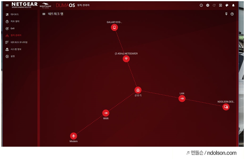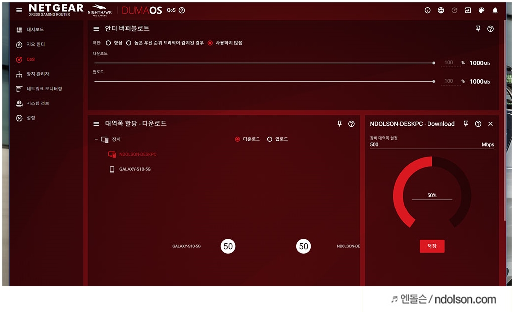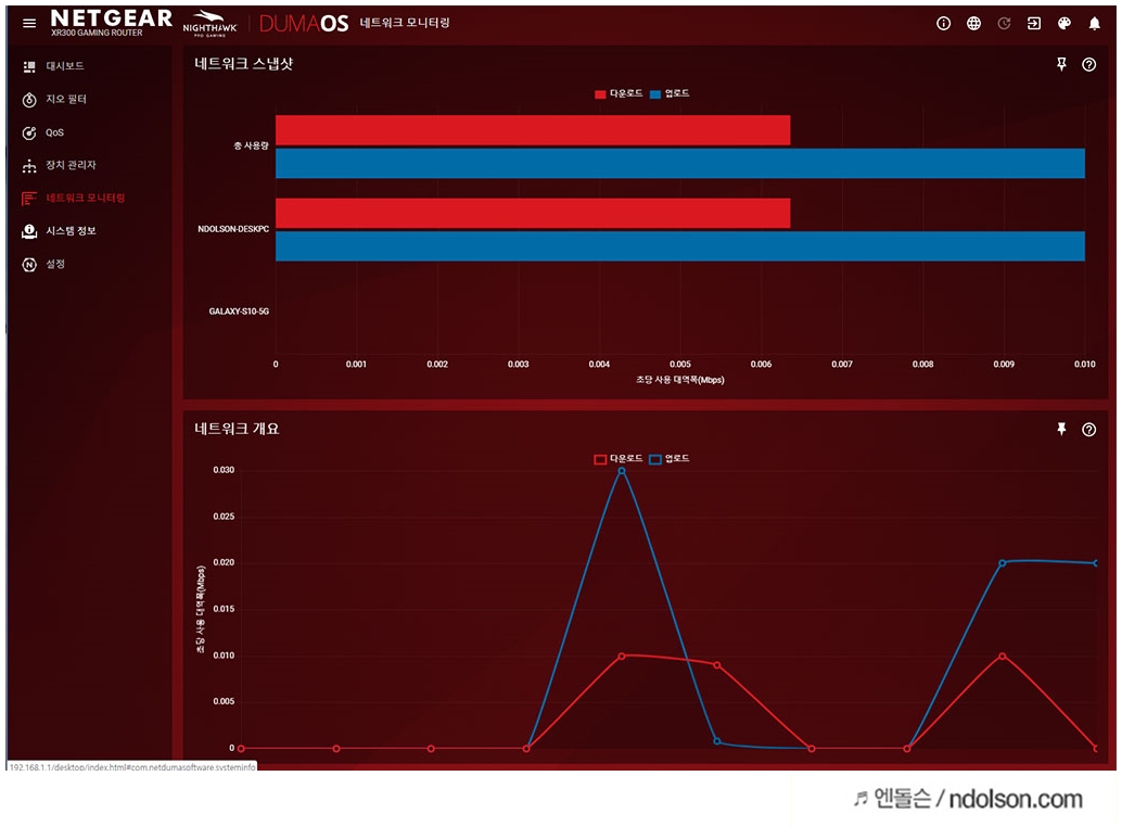 또 특정 프로그램을 설치하지 않고도 넷기어 나이트호크 XR300 게이밍 공유기 AC1750은 실시간으로 디바이스별 다운로드/업로드를 모니터링할 수 있습니다.