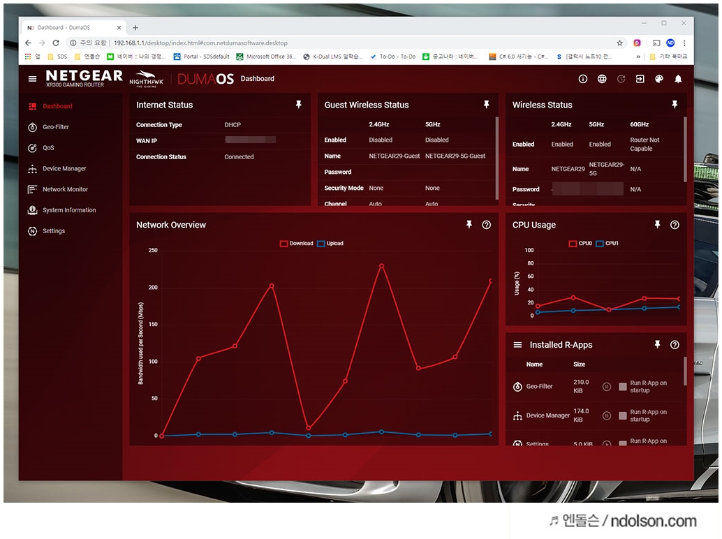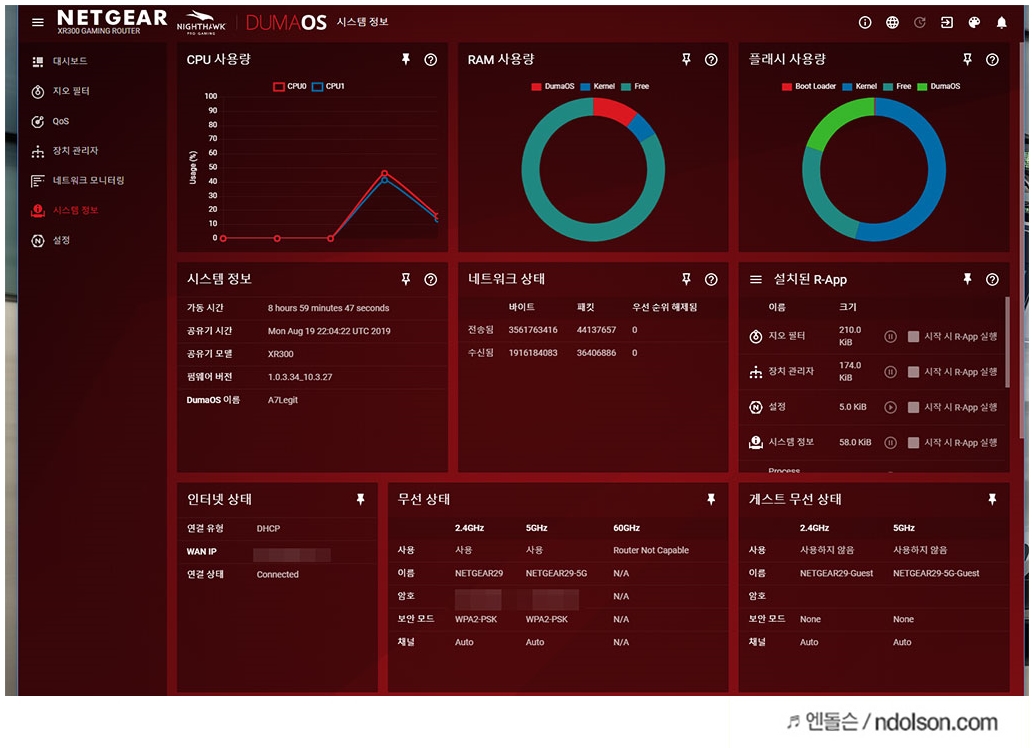 우선 넷기어 공유기 관리페이지를 보면, 매우 심플하고 좋습니다. OS 전문업체인 듀마OS(Duma OS)로 되어 있어 나만의 커스텀마이징 대시보드를 만들 수 있습니다.