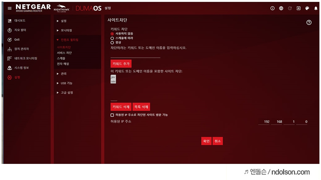 공유기에서 자녀 보호를 위한 성인사이트 및 키워드 차단이 가능합니다. 특정 단어로 된 키워드나 도메인을 입력하면 접속하지 못하게 하는 것인데요. 어린 자녀가 있는 경우, 음란사이트를 차단할 수 있습니다.