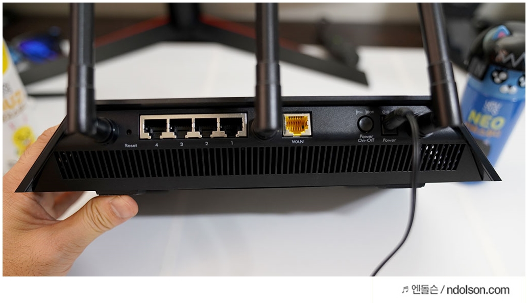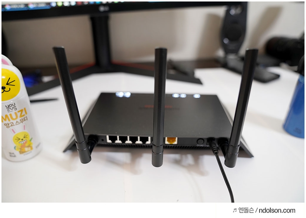 고성능 안테나가 3개 달려 있습니다. 탈착식은 아닙니다. XR500 최고급 게이밍공유기와 비교하면 안테나가 1개 부족하며, 탈착식이 아니라는 차이가 납니다.