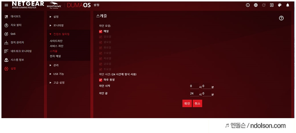 또 과도한 인터넷 사용을 방지할 수 있는 스케줄 기능도 있습니다. 그외에 포트 및 IP대역으로 차단도 가능합니다.