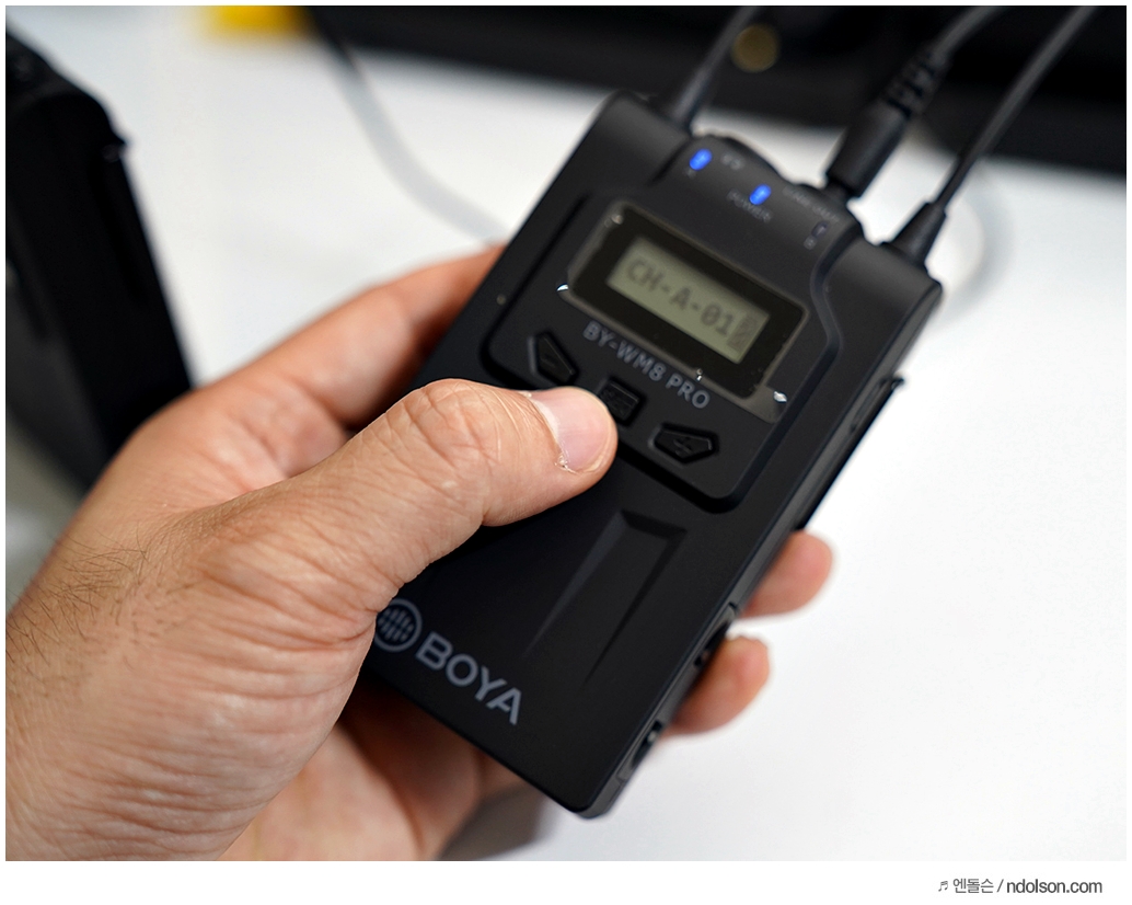 보야 무선마이크 (BOYA BY-WM8 PRO-K1)의 사용을 위해서 수신부, 송신부의 CH채널을 맞추어야 합니다. CH-A-01 채널로 맞추어 세팅하였습니다. 채널 변경은 +/- 볼륨 조정 버튼을 길게 눌러 SET버튼을 눌러 조정이 가능합니다.