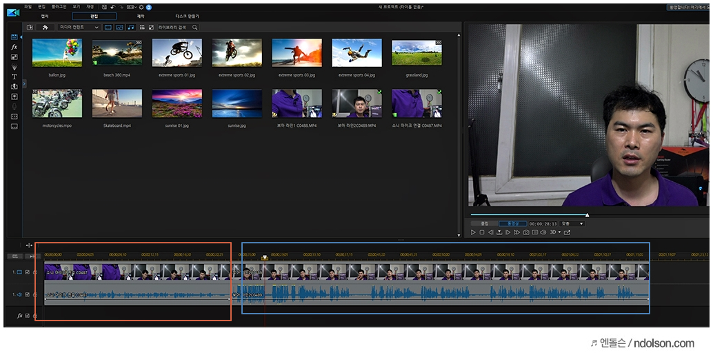 빨강색 부분이 소니 샷건마이크를 이용하여 녹음한 부분입니다. 파란색 부분이 캠코더로 바로 IN/OUT한 부분입니다. 영상편집 툴을 이용해서 보면, 소니 샷건 마이크는 음질이 고르게 나옵니다. 문제는 음량이 너무 낮습니다.