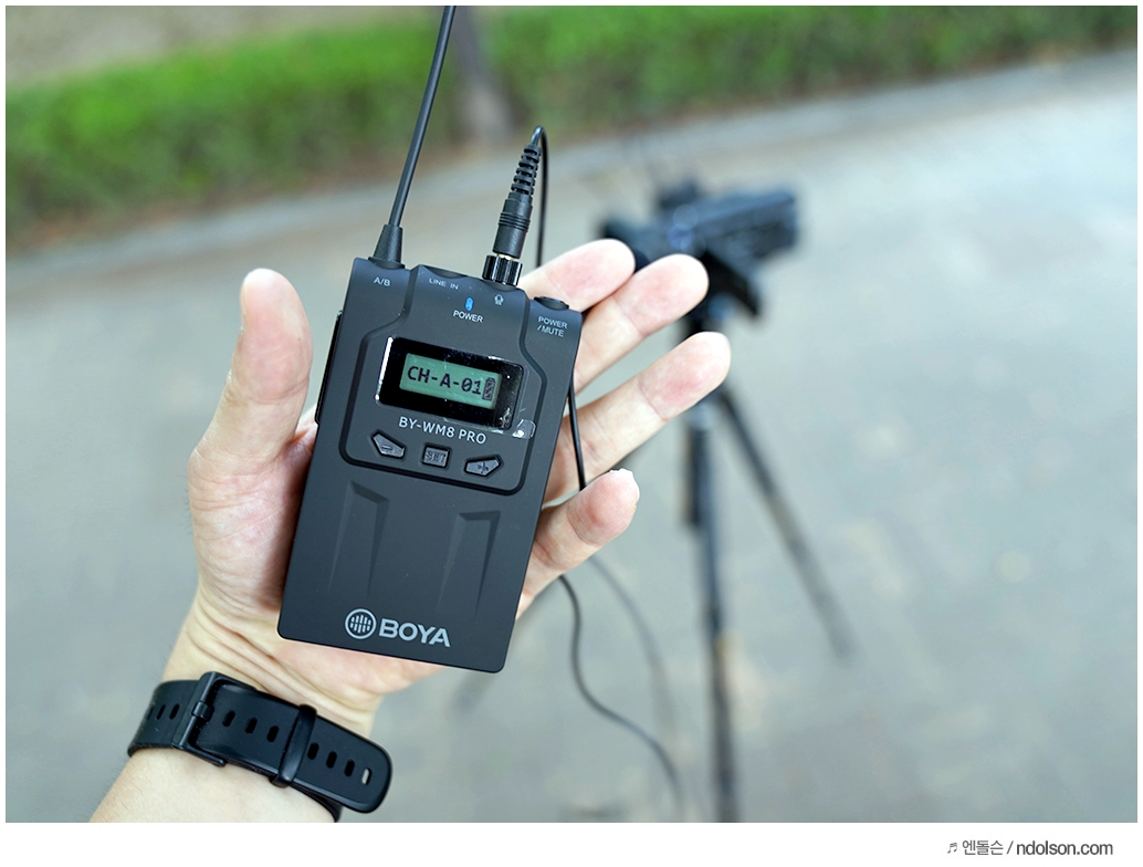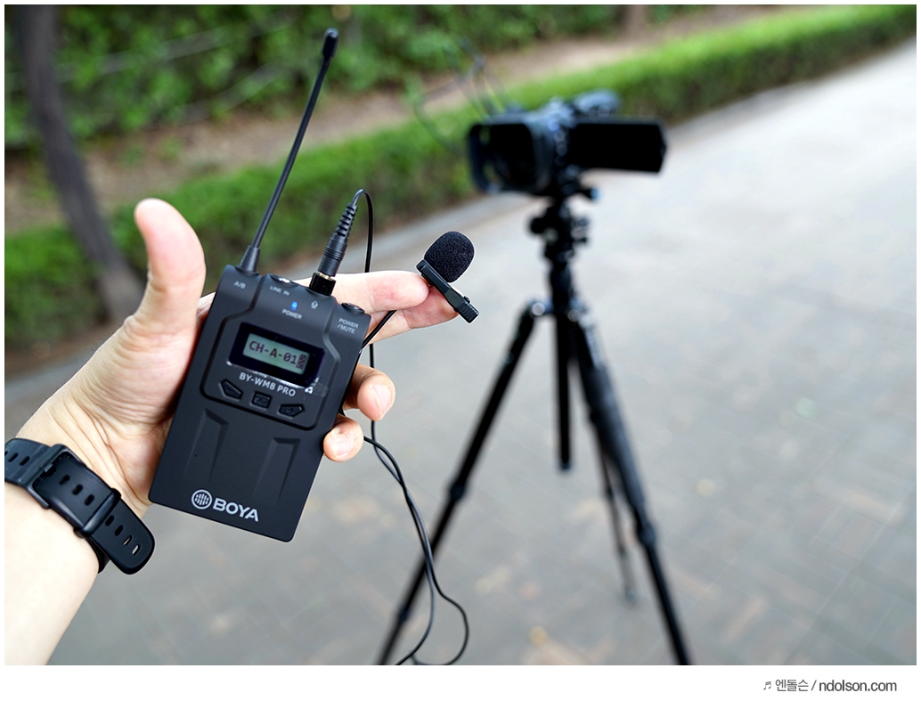 무선마이크 BOYA BY-WM8 PRO-K1와 소니 샷건마이크의 조합으로 사용하였습니다. 가지고 다녀야할 장비와 복잡할 수 있지만, 기존 음질과 음색을 그대로 유지하면서도 원거리에서 영상을 무선마이크로 녹음할 수 있어서 좋습니다.