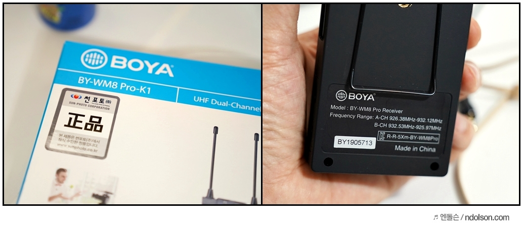 택배로 보야 무선마이크 BOYA BY-WM8 PRO-K1 모델을 받았습니다. 전면에 송신기, 수신기 모습과 정품 인증마크를 볼 수 있었습니다. 후면에 무선마이크 BOYA BY-WM8 PRO-K1 스펙을 보면, 모도/스트레오 조정이 가능하며, 대한민국 방송에 허용된 900MHz 대역 표시와 KC인증을 받은 무선마이크라는 걸 알 수 있습니다.