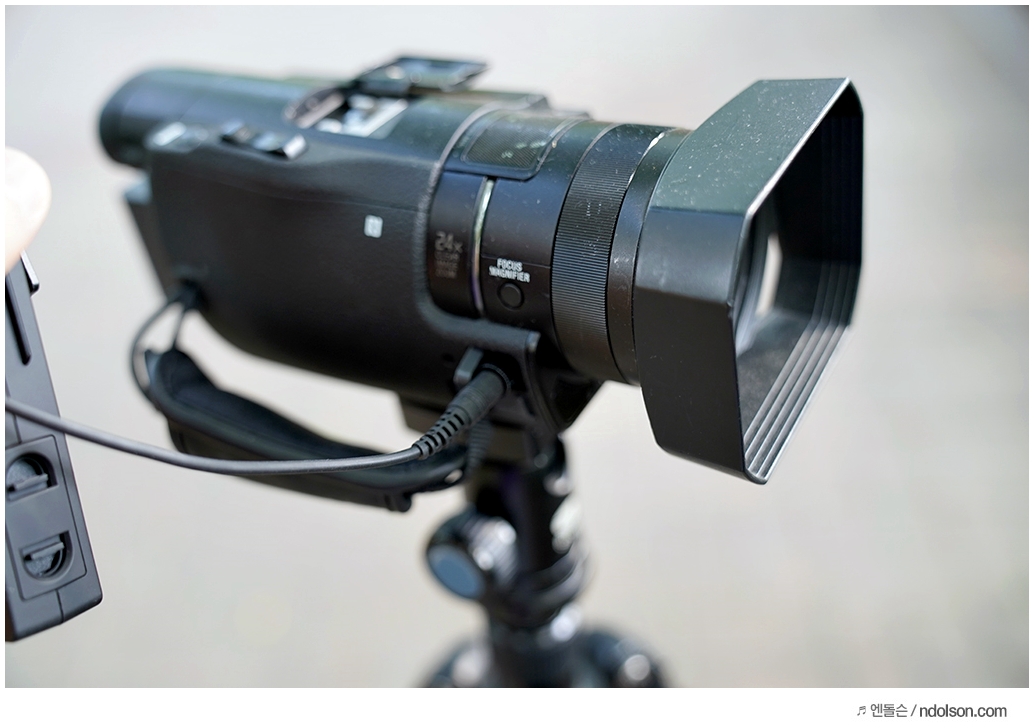 위와 같이 3.5mm 스트레오 케이블을 캠코더에 연결하여 IN/OUT 하여 녹화할 수 있습니다. 이런 경우 가장 간편하게 무선 마이크를 사용하는 방법입니다. 이때는 무선마이크와 캠코더의 조합에 의해서 음질과 음색이 정해집니다.