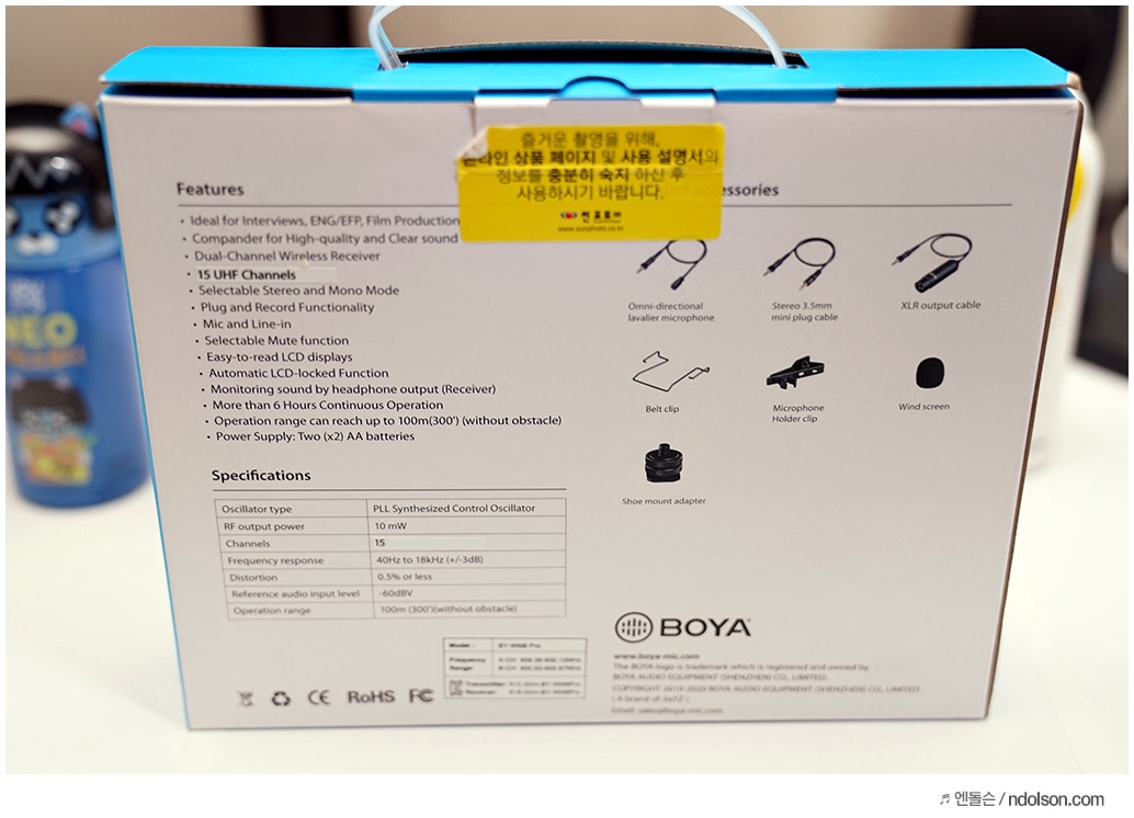 택배로 보야 무선마이크 BOYA BY-WM8 PRO-K1 모델을 받았습니다. 전면에 송신기, 수신기 모습과 정품 인증마크를 볼 수 있었습니다. 후면에 무선마이크 BOYA BY-WM8 PRO-K1 스펙을 보면, 모도/스트레오 조정이 가능하며, 대한민국 방송에 허용된 900MHz 대역 표시와 KC인증을 받은 무선마이크라는 걸 알 수 있습니다.