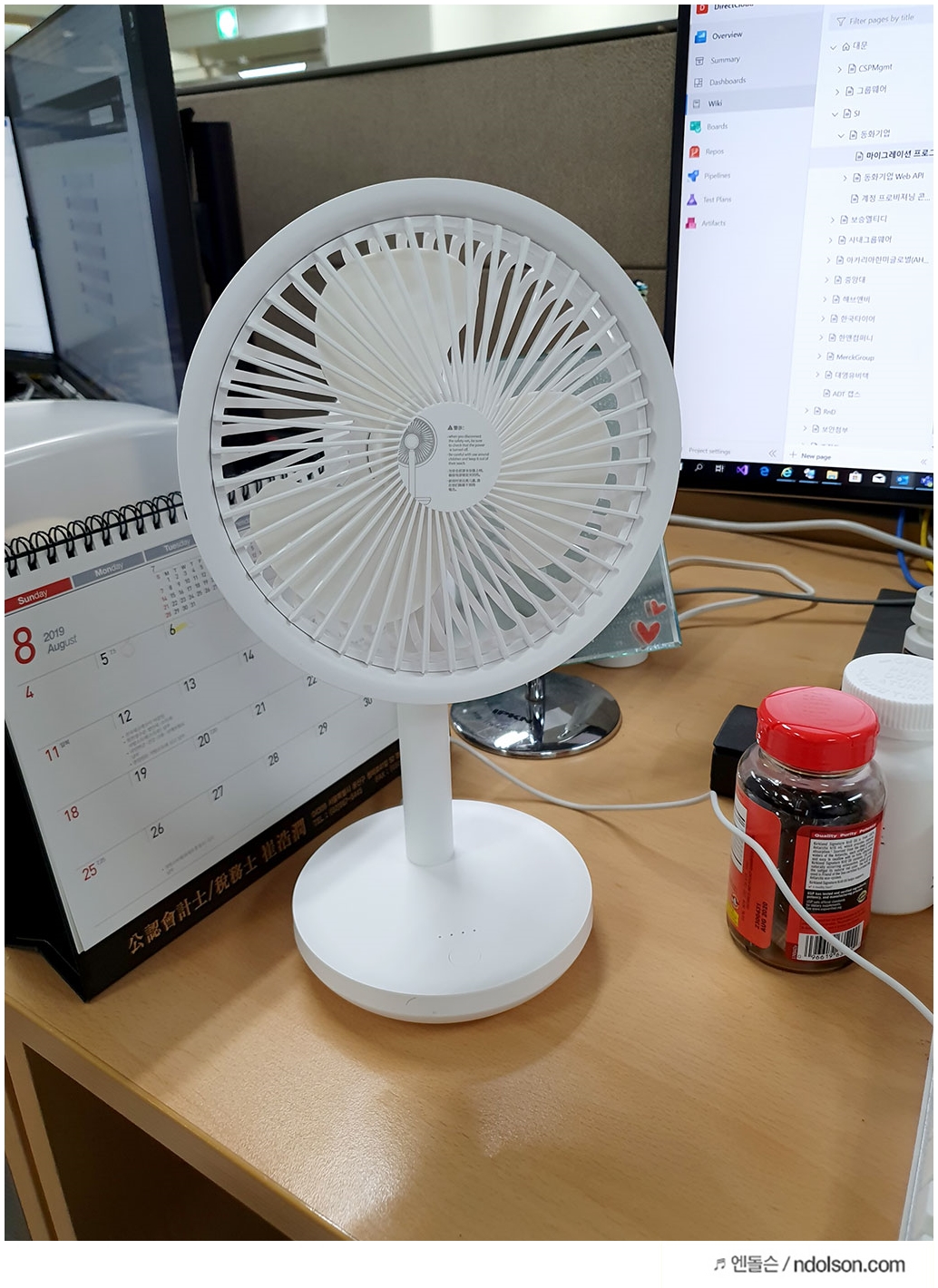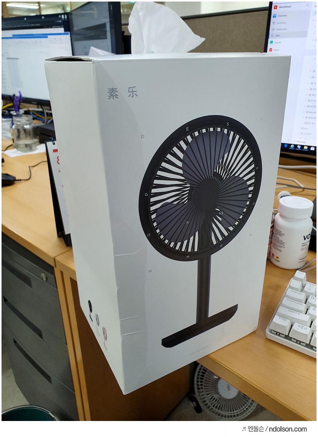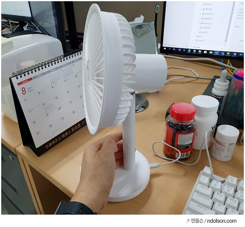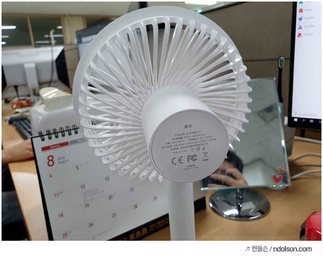 사무실 책상위에 샤오미 쏘러브 탁사용 선풍기를 올려 두었습니다. 가격은 2만원 이하의 저렴한 가격에 배송비 포함에 해외직구로 구매할 수 있습니다.