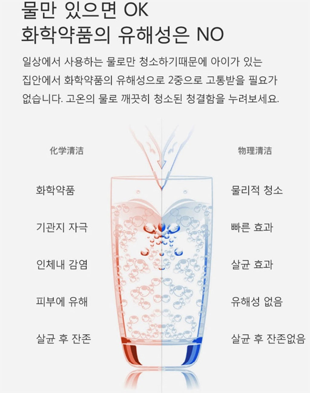 스팀청소기를 선택한 이유는 물로하기 때문입니다. 뿌려만 두는 제품보다 불편할 수 있지만, 안전하기 때문에 스팀청소기가 좋습니다. 기관지 자극이나 화학약품으로 좋지 않은 영향을 받는 것보다 물로만 하는 게 좋죠.